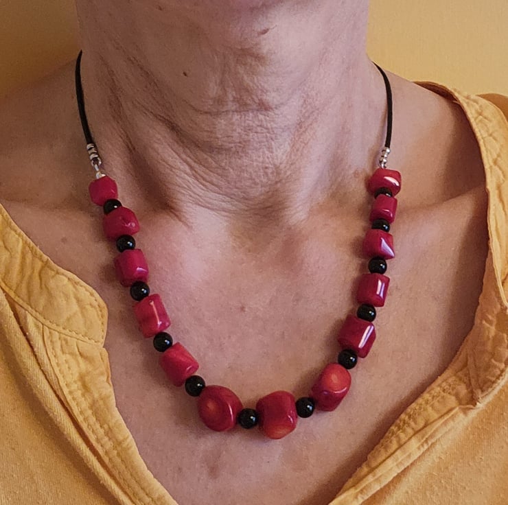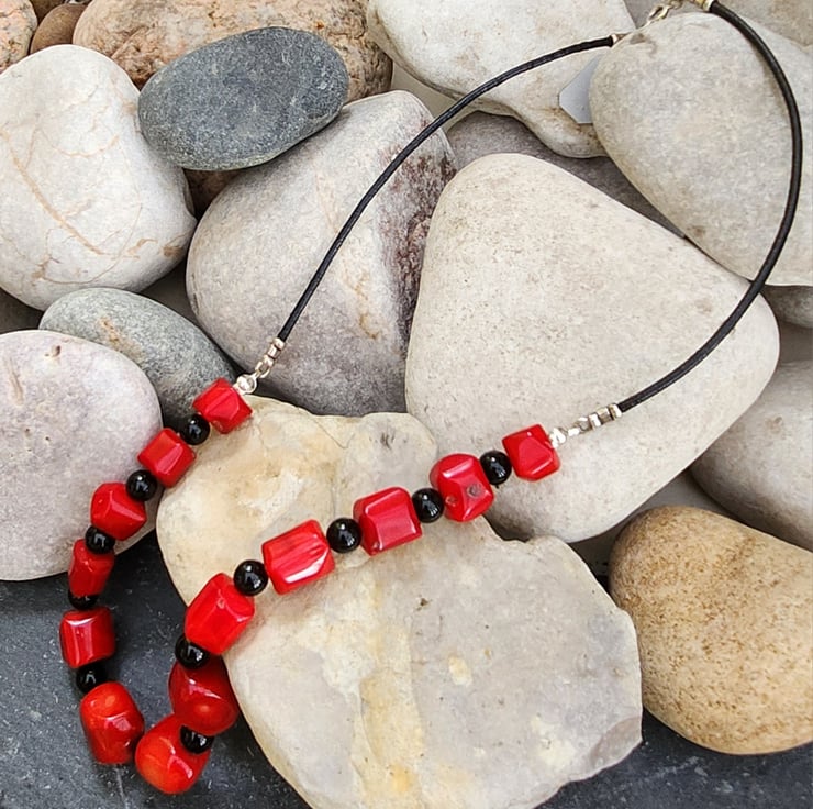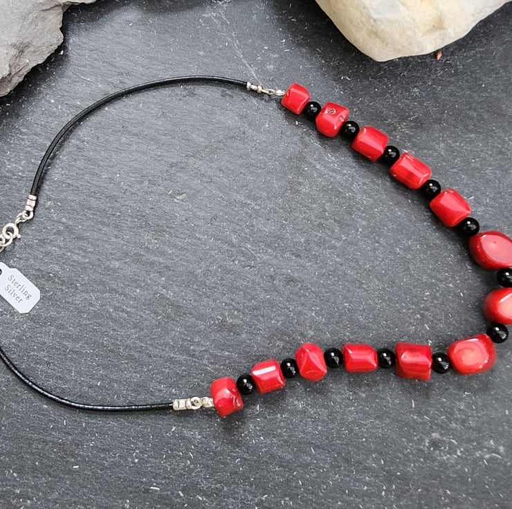 A ncklace of knobbly red coral and round 6mm black onyx stones. These are threaded on double nylon thread for extra strength and are half the necklace. The other half is black leather cord. Measures 18.5 inches in total. Sterliling silver connections.