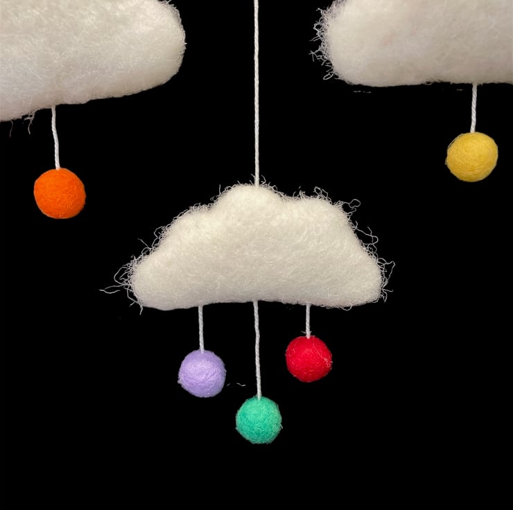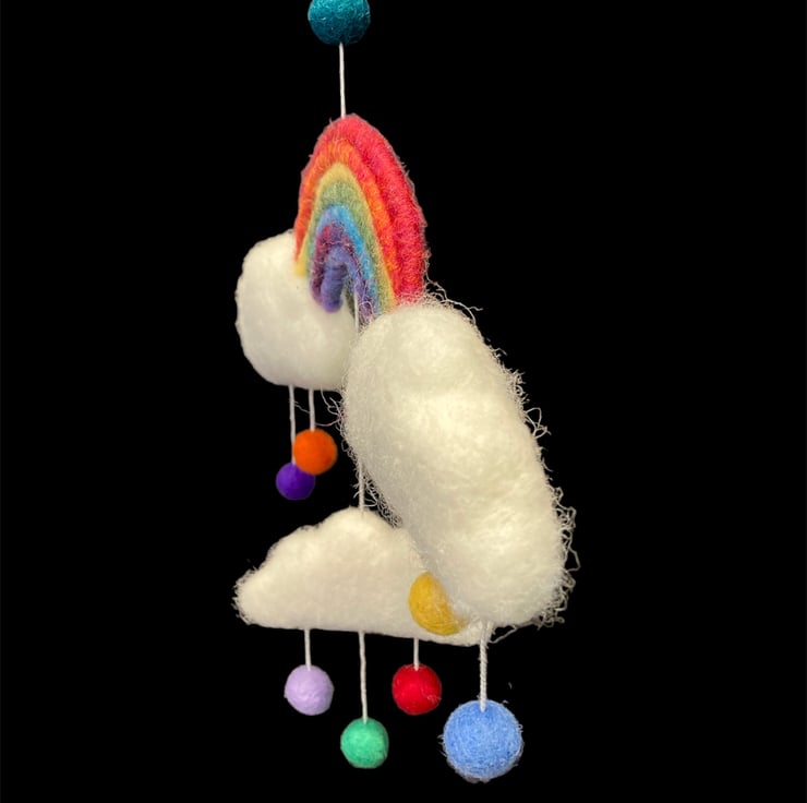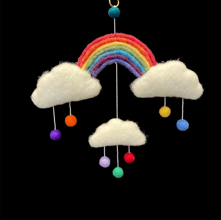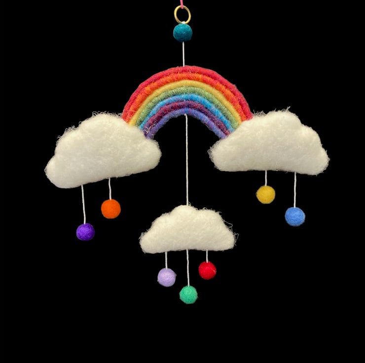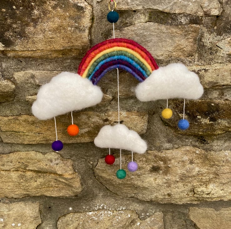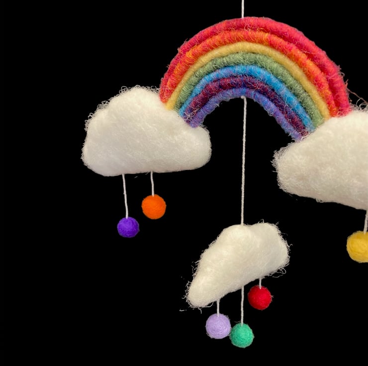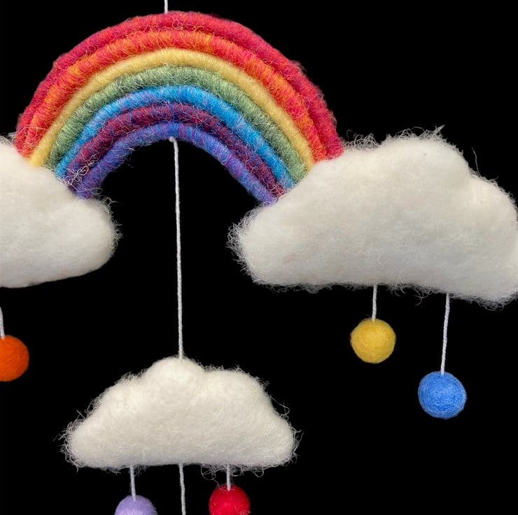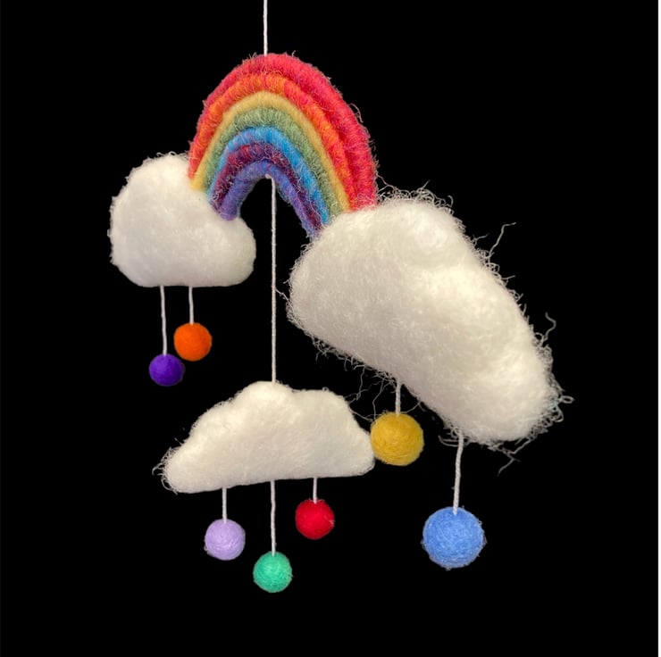 A perfect mobile or wall decoration for the nursery or playroom. This decoration consists of a multicoloured felted rainbow fixed between two large white fluffy clouds. A further slightly smaller cloud hangs below. Brightly coloured felt balls hang below the clouds. The clouds have been made using woollen fibres and are three dimensional in shape. White cotton thread has been used to suspend the felt balls from the clouds. A small brass ring has been added at the top to facilitate hanging. The decoration can be hung on the wall or suspended as a mobile above the cot. A perfect gift for a new baby or baby shower.