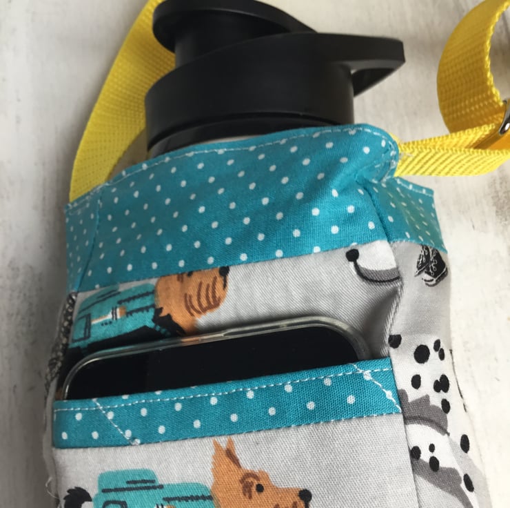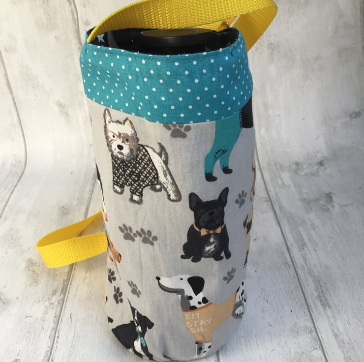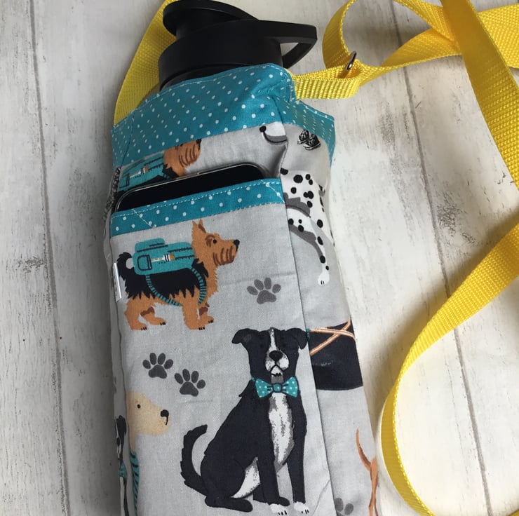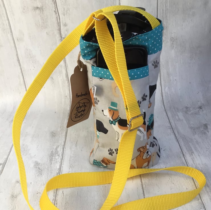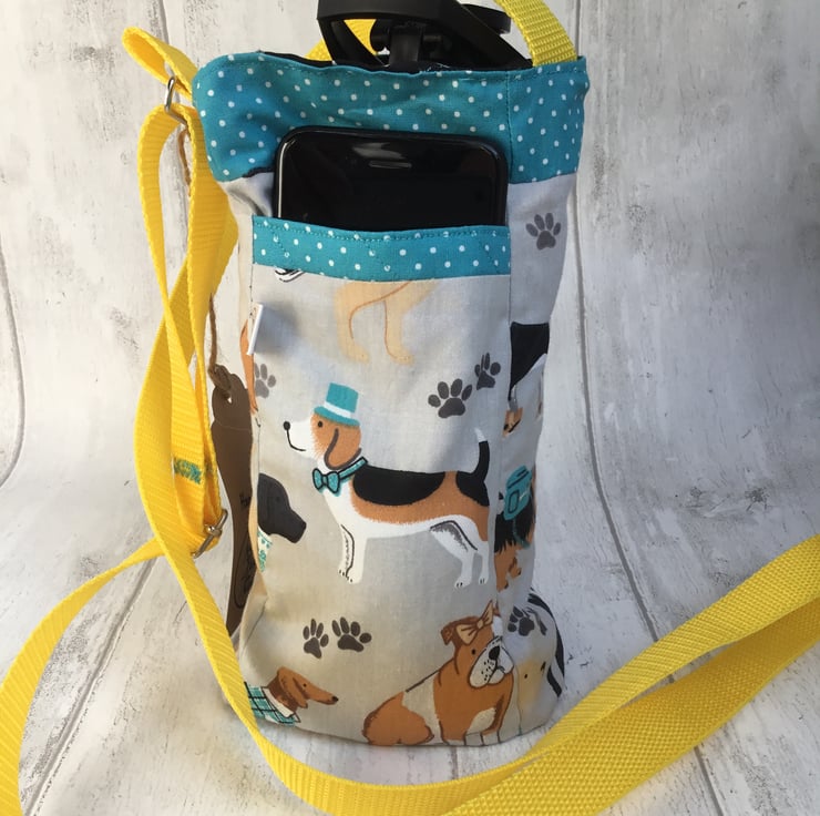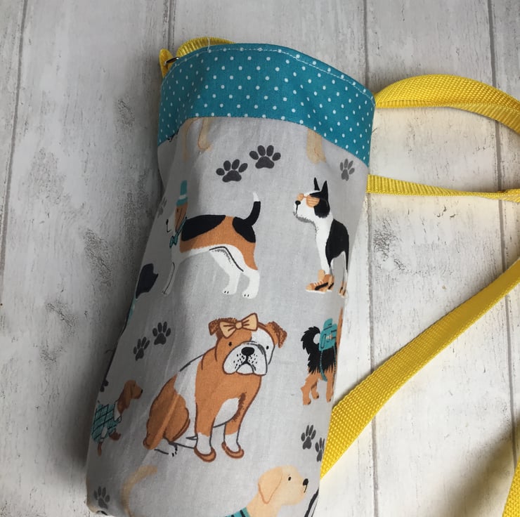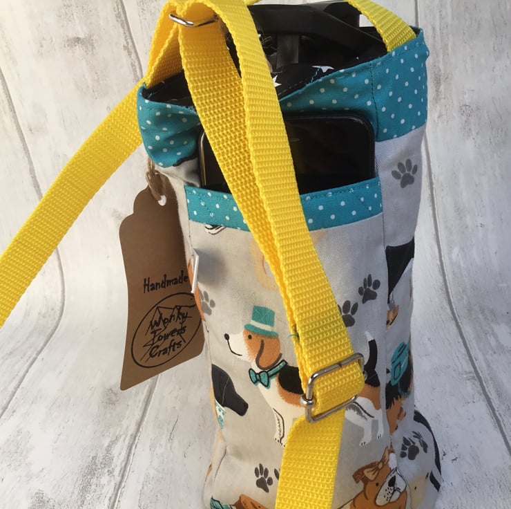 This lovely water bottle bag, made from lightly quilted, quality cotton fabric, is designed to be worn across your body. The outer fabric is decorated with a variety of dog breed images. Coordinating black and turquoise fabrics enhance the bag and the strong yellow strap completes it. The strap is more than able to take the weight of a full water bottle without stretching and the length is adjustable to suit your height. With no fastenings, your drink is easily accessible whilst being held safely upright.