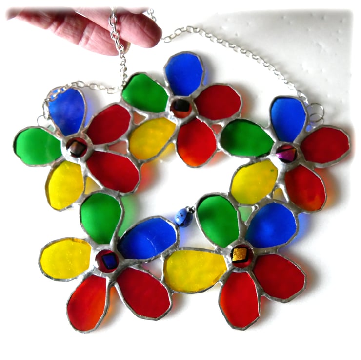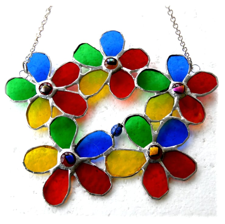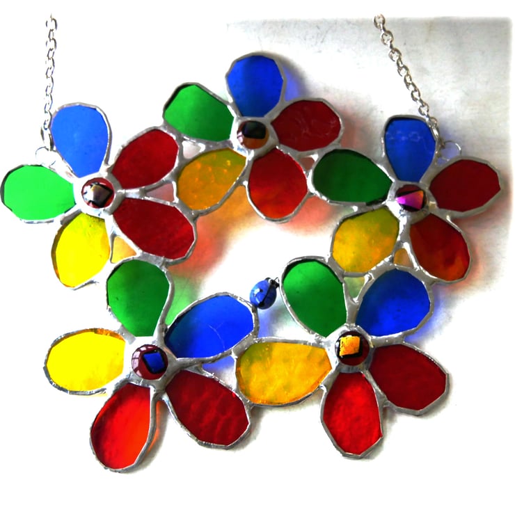 A floral wreath, 5 five petal rainbow flowers with a dichroic decorated glass nugget in the centre of each. I've added a little blue glass beetle between the petals to give it a little quirkiness.