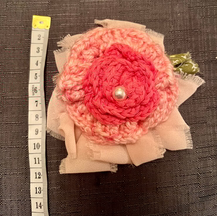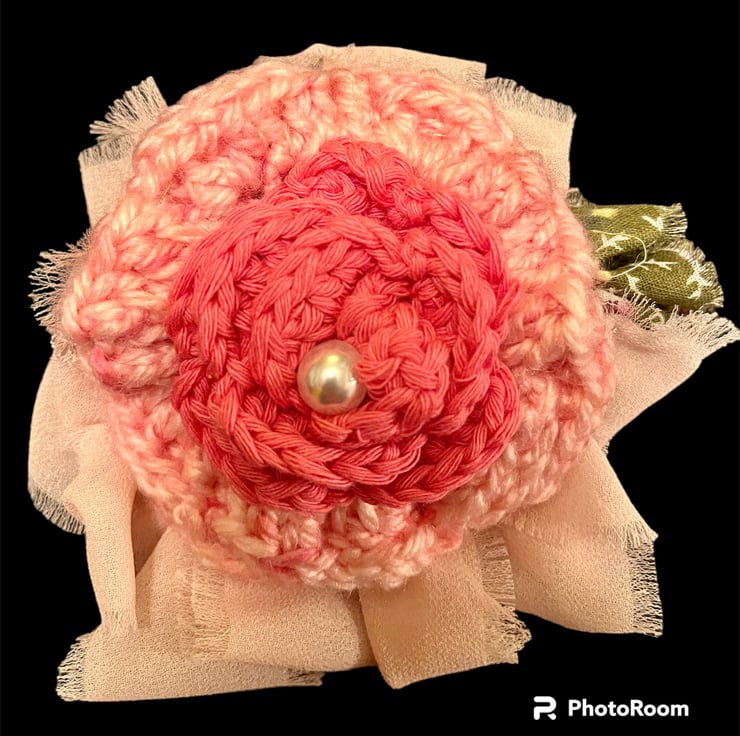 The beautiful vintage brooch is created with a variety of different materials that include a crocheted rose, ribbon & faux pearl embellishment with a pin back. The delicate embellishments makes this ONE OF A KIND.