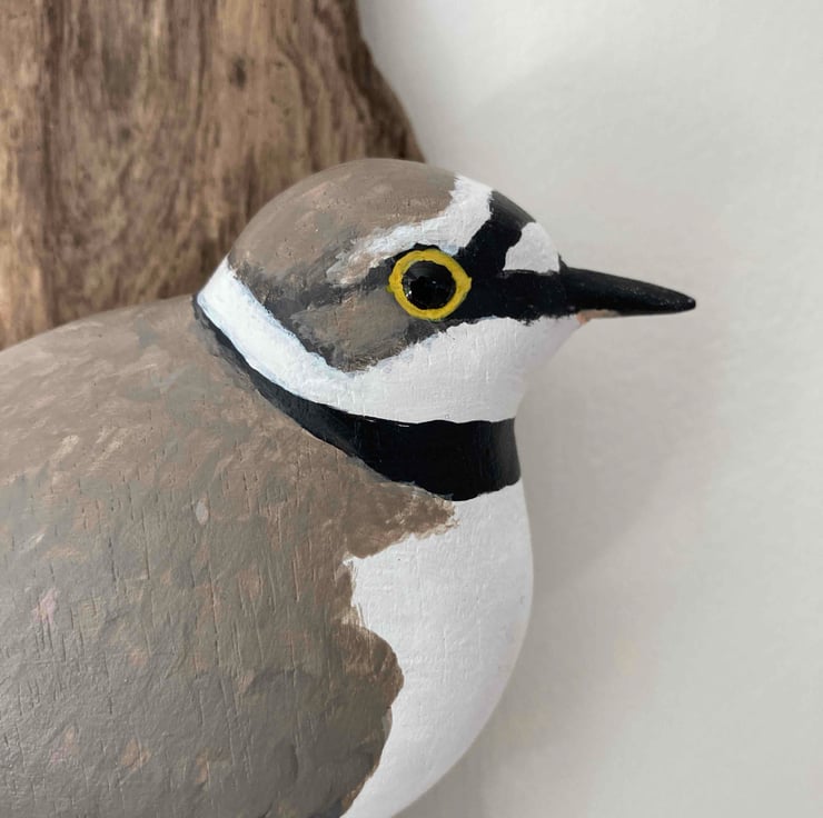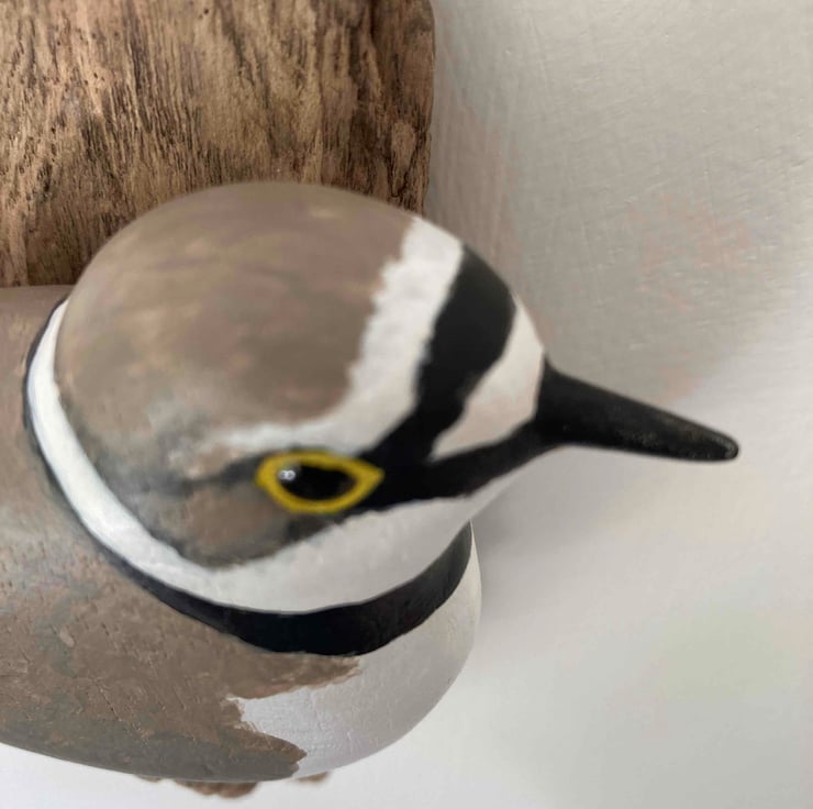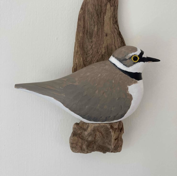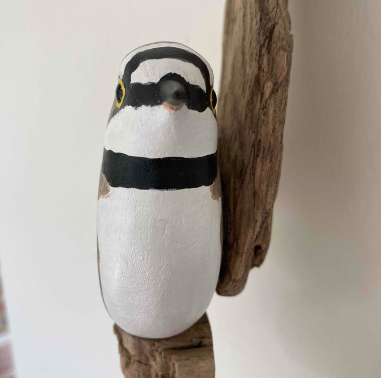This little bird has been hand carved and then painted with artists acrylics. It has hand coloured glass eyes and has been finished with wax to give a soft shine. I have mounted it on pretty pieces of driftwood and it would be a lovely gift for any bird lover. It is 21cm tall (not including the twine hanging loop) and the bird is 13cm from beak to tail.