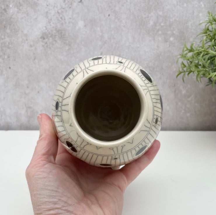 I’ve thrown this vase on the wheel in stoneware clay, carving the design with a thin needle. An abstract design, it incorporates elements from flowers and leaf stems, combined into a repeating pattern that circles the pot. I’ve then inlayed black underglaze into the carved linework to achieve the thin dark lines against the warm buttery off-white clay body & painted the spots.