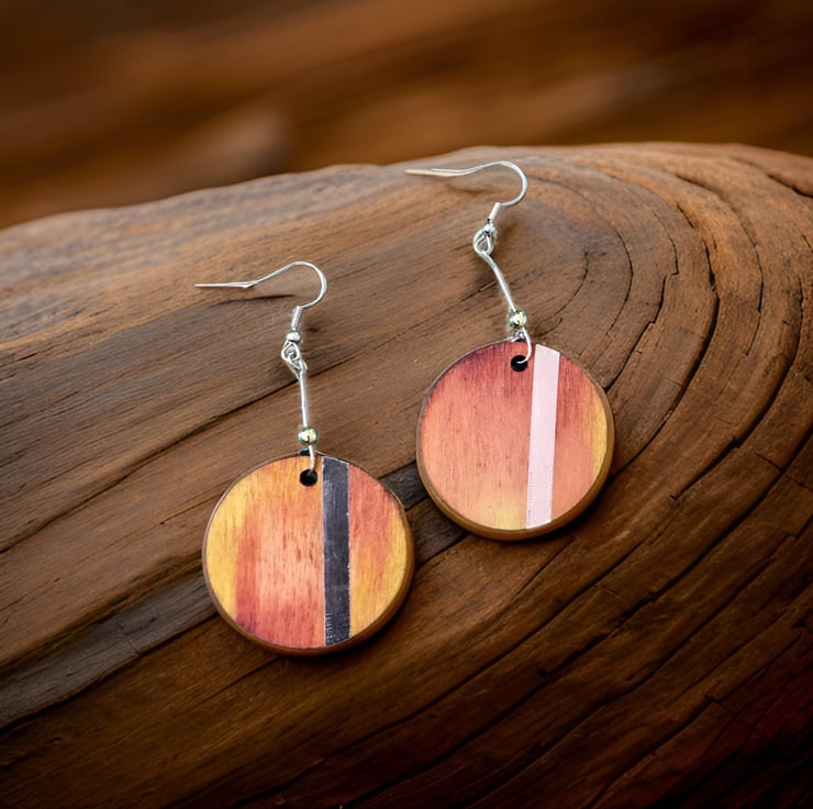 Earrings - Boho style, Dangle, Alcohol Ink & Copper. on Wood - Gold Plated. Drop is approx 1.50”. Hook ear wire. Wood earring 25mm.