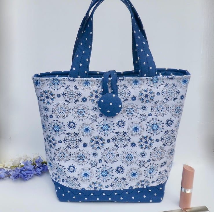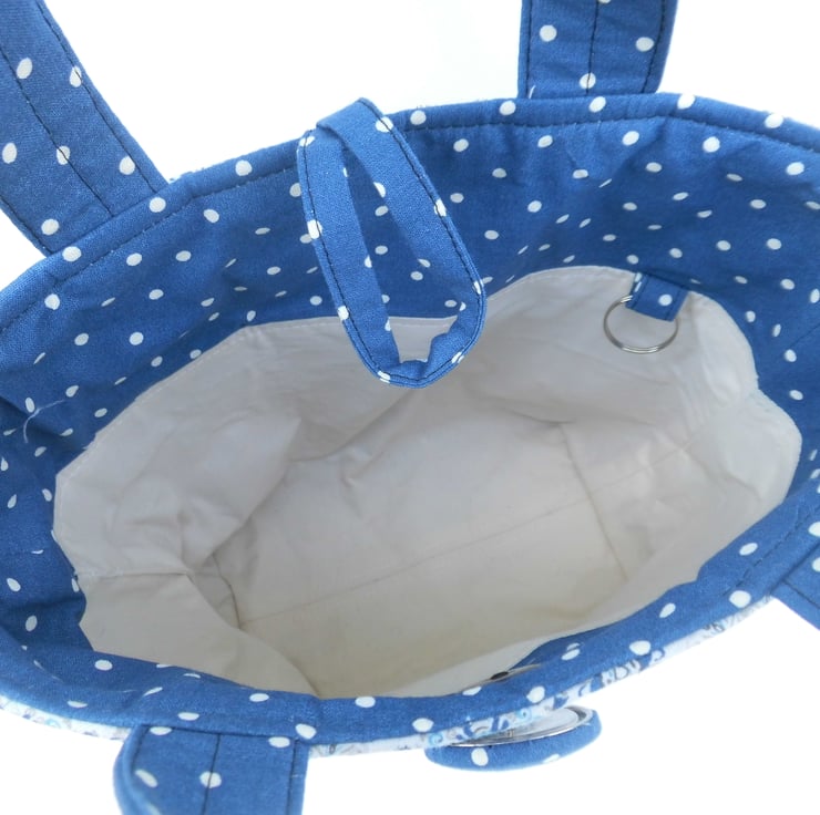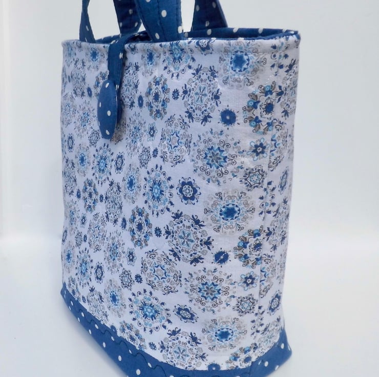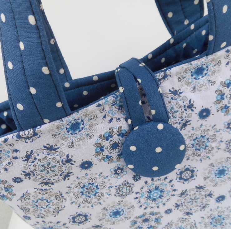 This handbag is made using two fabrics in a navy blue and white combination. Both 100% cotton, one is navy with small white spots and the other has a white background with circular designs in shades of blue and beige. I backed the fabric with felt to give it body and maintain shape, attached by sewing across the body of the bag with wave stitch. Faced inside at the top with the navy fabric and then lined with a plain poly/cotton lining. The lining is backed with fusible interfacing for more body. Inside there is a jump ring on which to clip your keys or other essentials and the bag can be fastened with a loop around a large cover button.