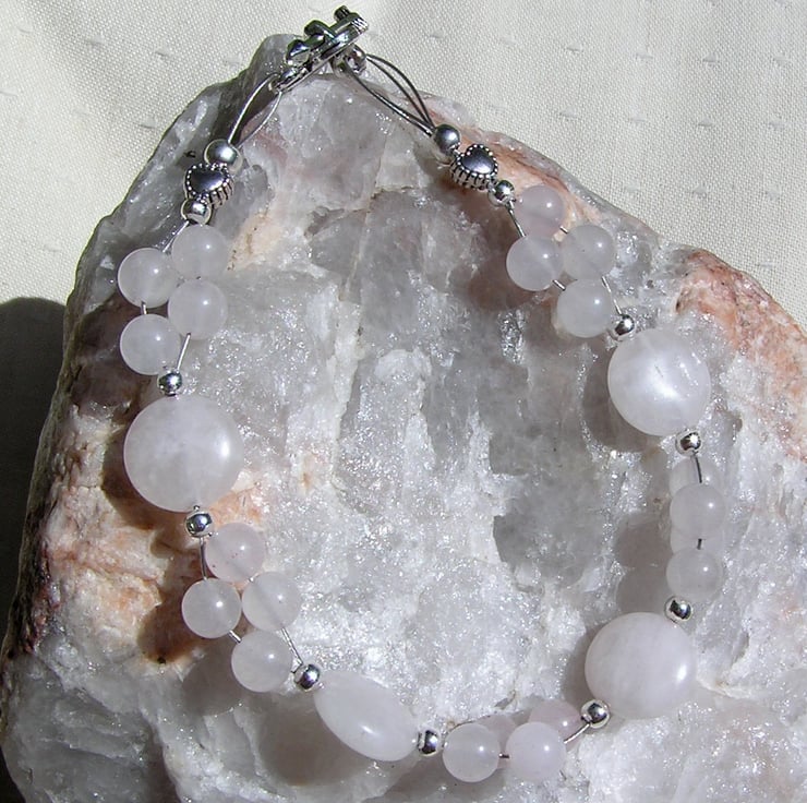 This Stunning Bracelet is made wholly from Pale Pink Rose Quartz… Coin shaped beads separated by small rounds beads which are clustered together in four's and for that added bit of sparkle tiny Silver spacer beads - a Romantic effect that will look stunning either worn casually or with something more Elegant for a Special Evening out