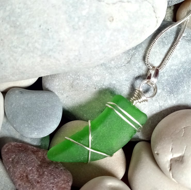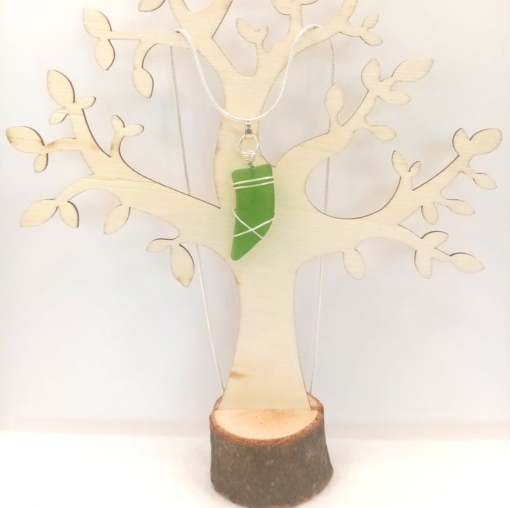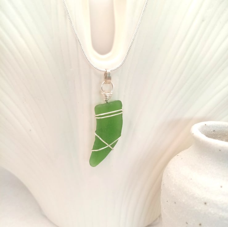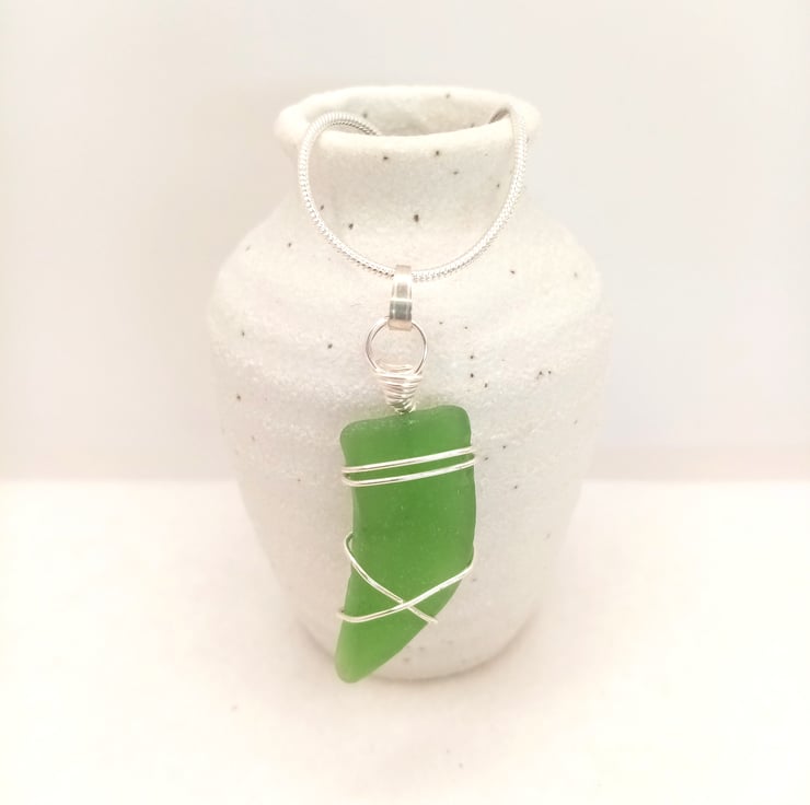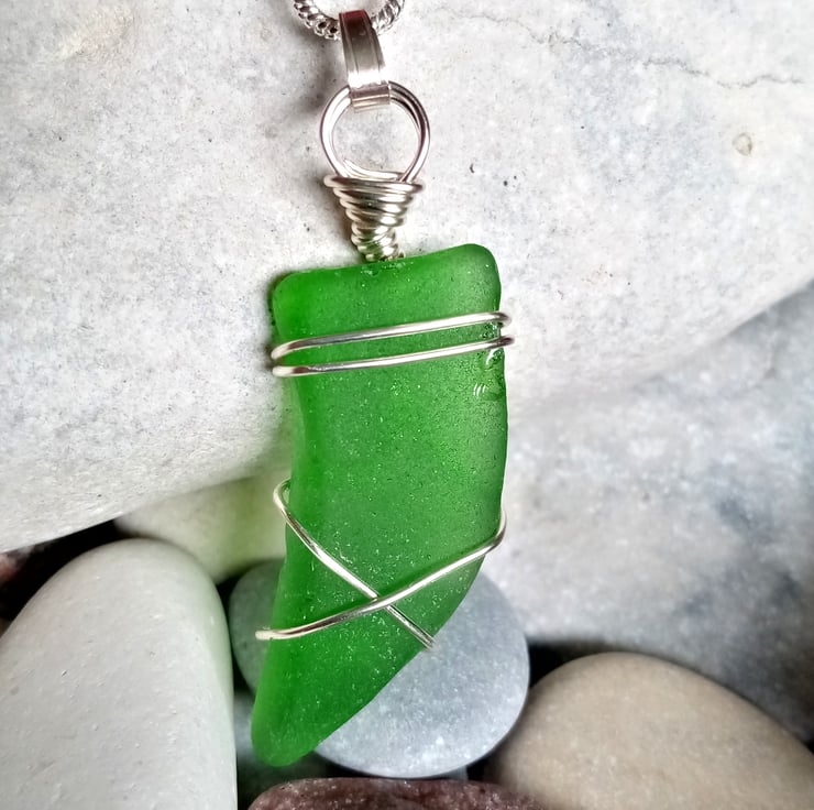 Sea glass wire-wrapped pendant hand-crafted in Ireland using silver plated copper jewellery wire with a tarnish resistant coating and locally sourced sea glass finds.