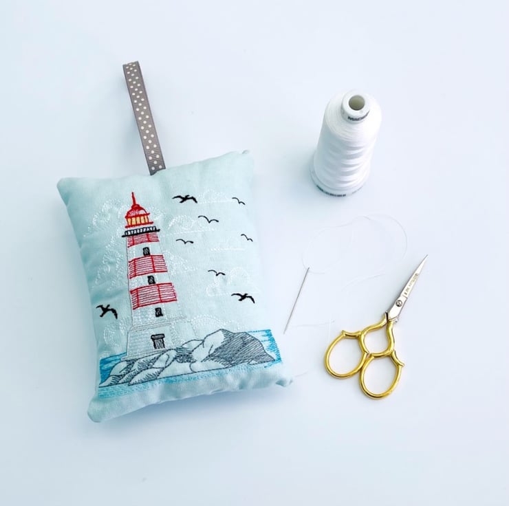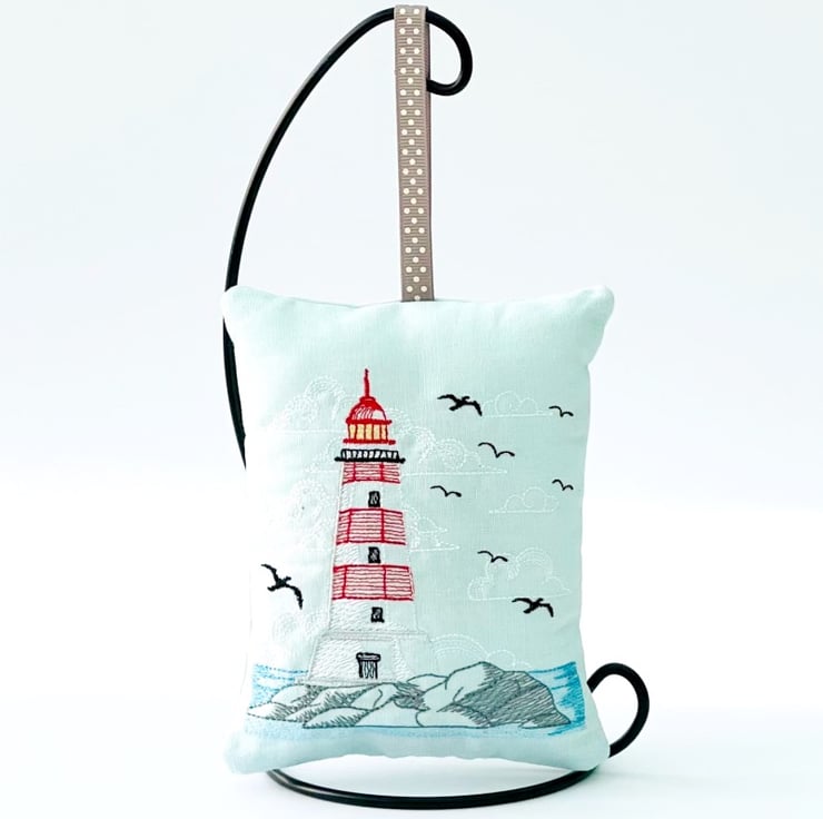 Machine embroidered on a linen fabric with a grosgrain ribbon for hanging or it can just be placed in a drawer or on a shelf. The Lavender scented bag is Partially filled with a high grade hollow fibre polyester and some lavender flower buds.
