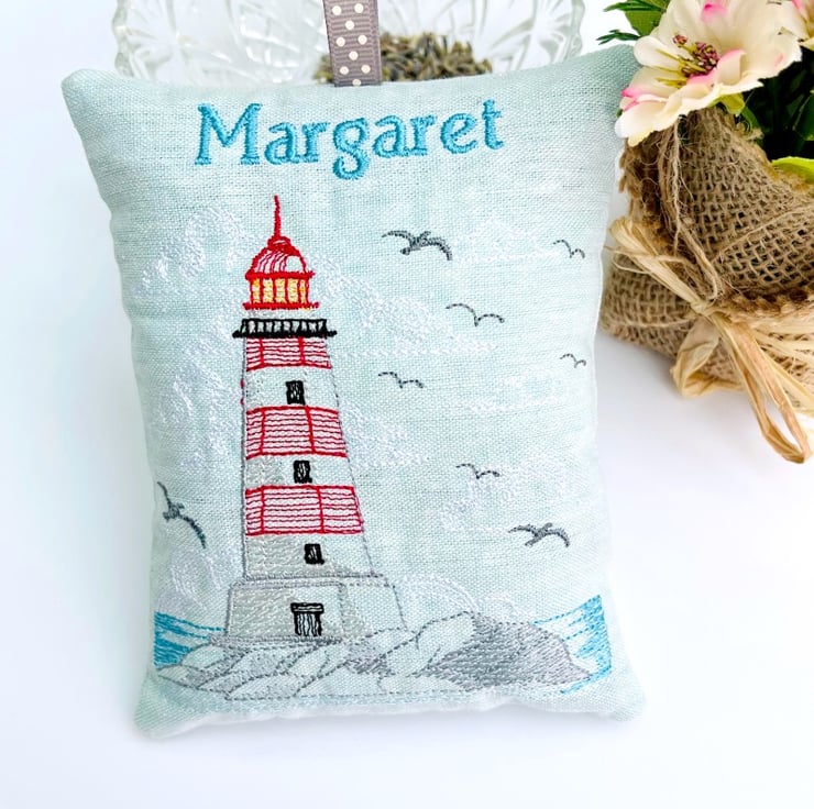 A beautiful Lighthouse Beach Scene Lavender Bag which has a nostalgic feel for those visits to the beach.