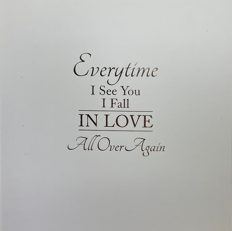 The card measures 15 x 18 and has the message Every Time I See You I Fall in Love All Over Again inside.