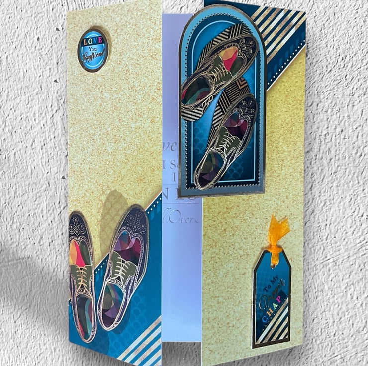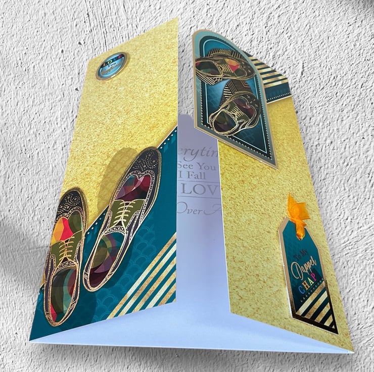 This gorgeous card in tones of blue and gold has the messages ‘To my Dapper Chap’ and ‘Love you boyfriend’ Make his day extra special with this thoughtful and unique card.