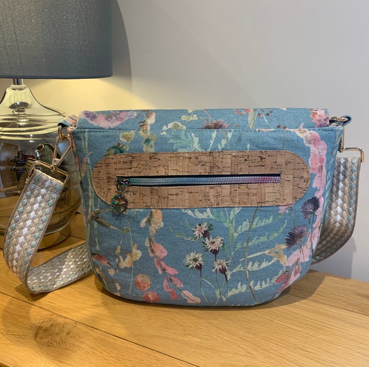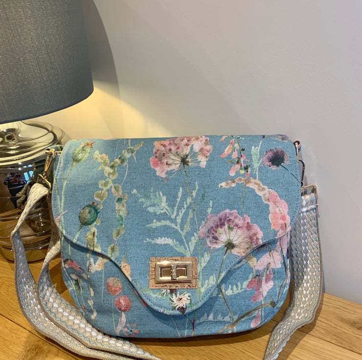 Cotton / linen crossbody bag in the Saddlebag style . Made from pretty summery turquoise hedgerow flowers print fabric . Accents of cork on rear rainbow coloured zip opening and front flap turn lock fastener . The bag is lined with beige waterproof canvas and has a zipped pocket and slip pockets . A pretty adjustable woven strap completes the crossbody / shoulder bag .