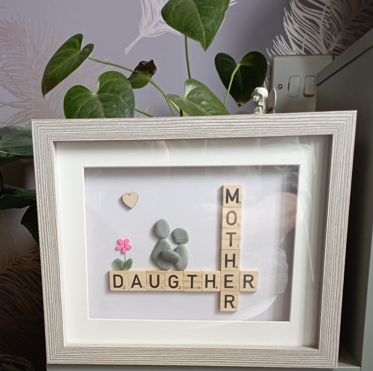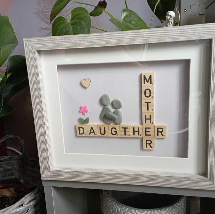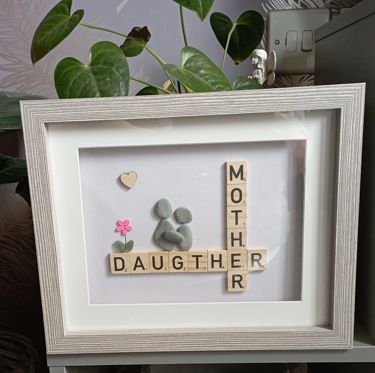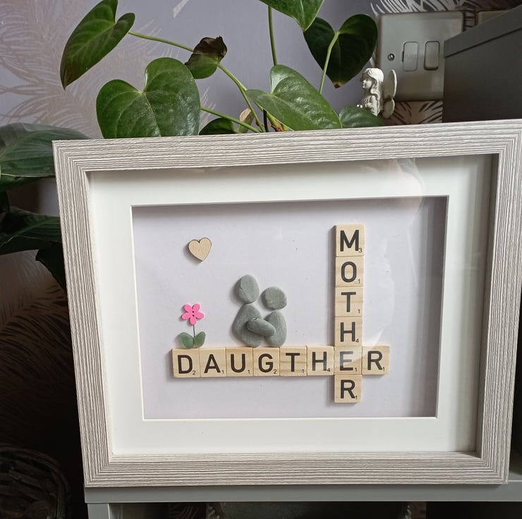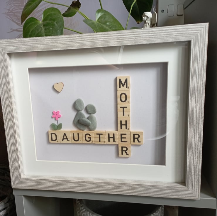 Pebble art frame with Scrabble letters.