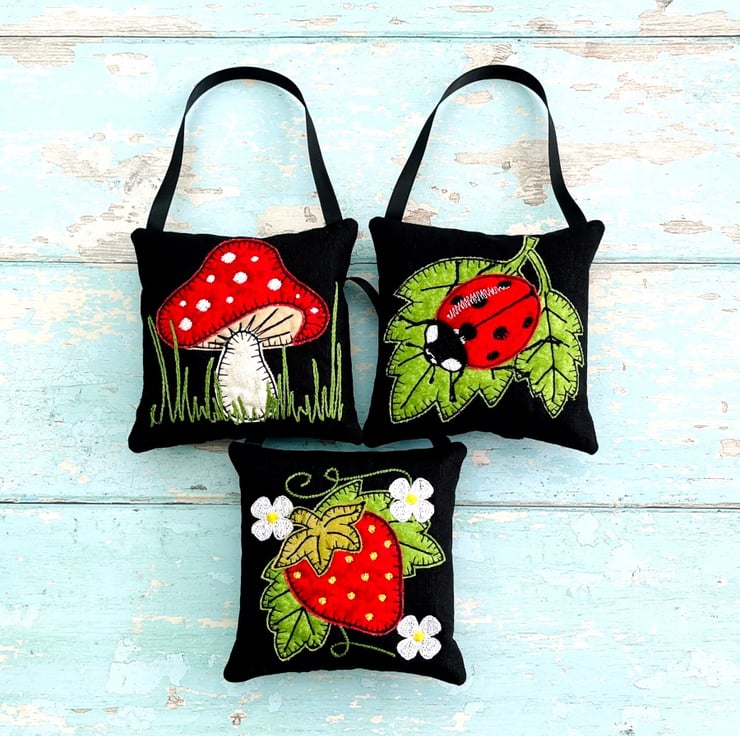 A beautiful appliquéd Nature Themed Lavender Bag with a Ladybird Ladybug design on a black linen.
