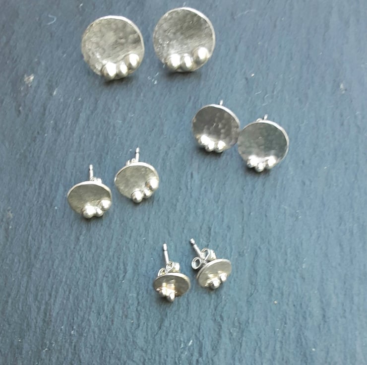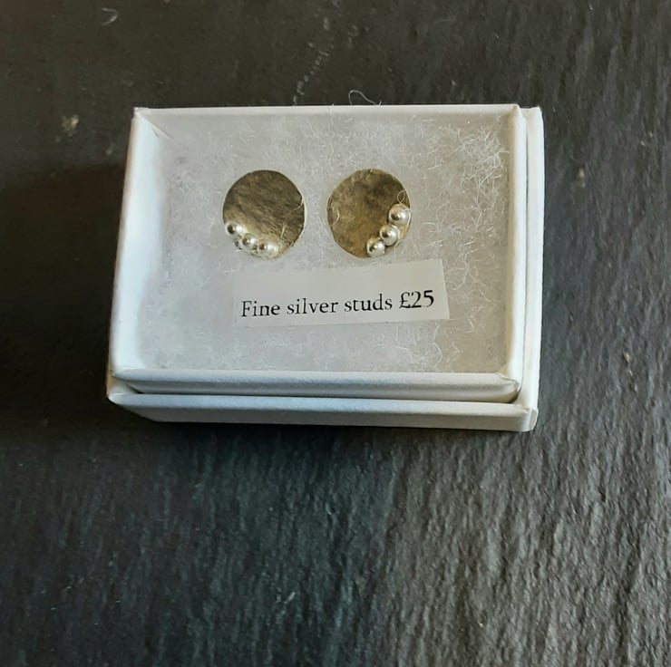 These delightful stud earrings are made from 'fine'silver, which I have hammered, made silver bobbles which have been soldered onto them. I have also soldered sterling silver pin on the back along with sterling silver butterfly backs.