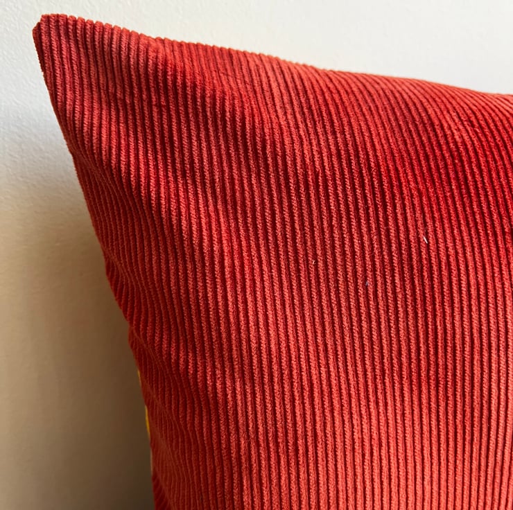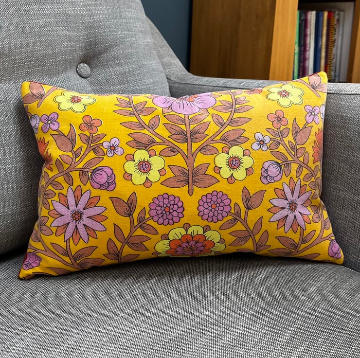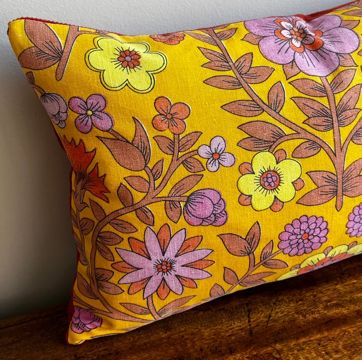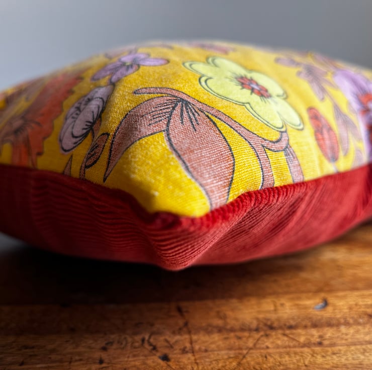 Bright retro print cushion cover in reclaimed Roundelay cotton. The colourful pink, yellow and orange floral l is backed in soft orange corduroy from a sample swatch leftover from the fashion industry.