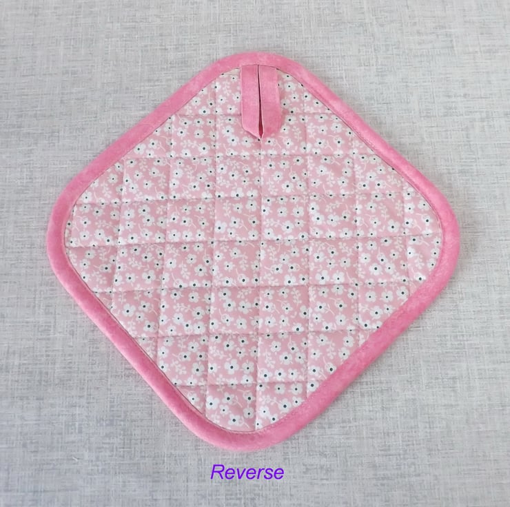 A pot holder made from a lovely quilting cotton fabric with a cup cake design in shades of pink, lilac, white, blue and more, on a cream background. The contrasting fabric is pink cotton with small white and blue flowers on it.