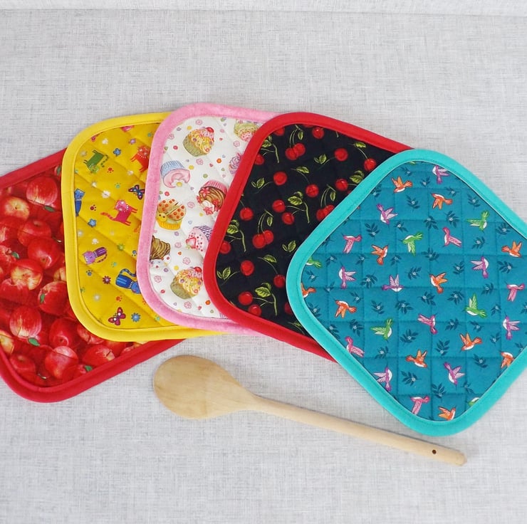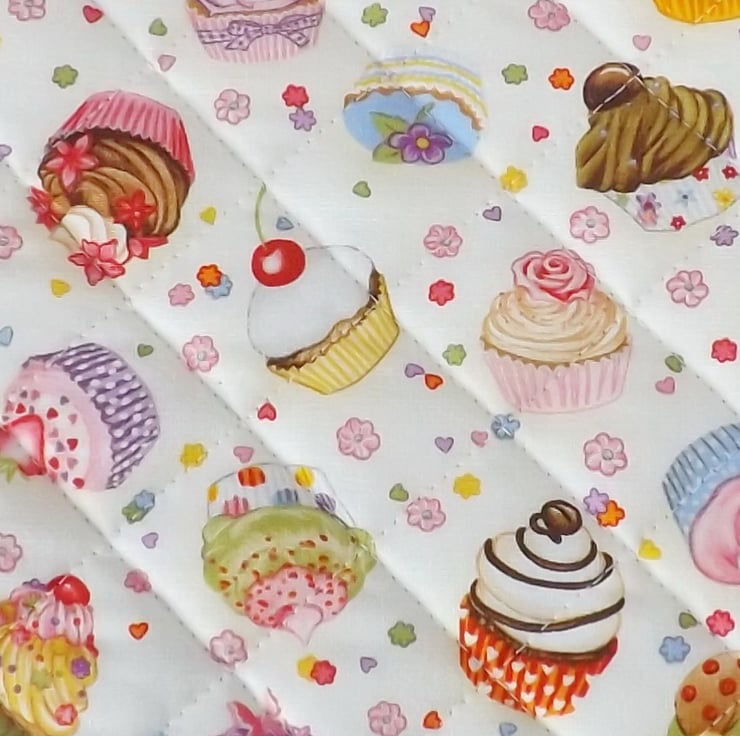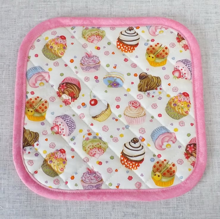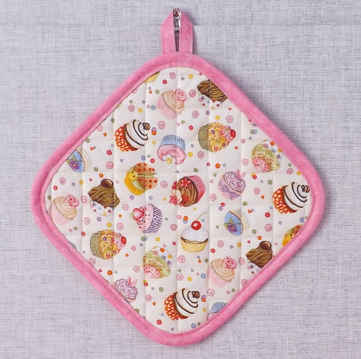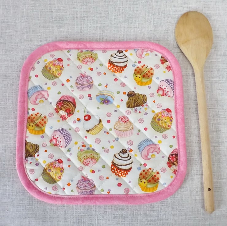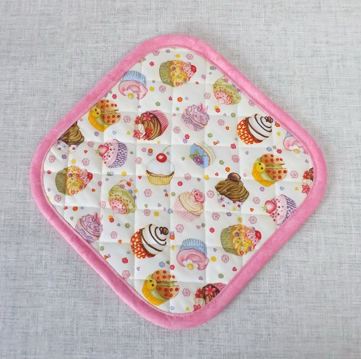 A pot holder made from a lovely quilting cotton fabric with a cup cake design in shades of pink, lilac, white, blue and more, on a cream background. The contrasting fabric is pink cotton with small white and blue flowers on it.