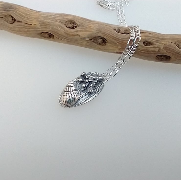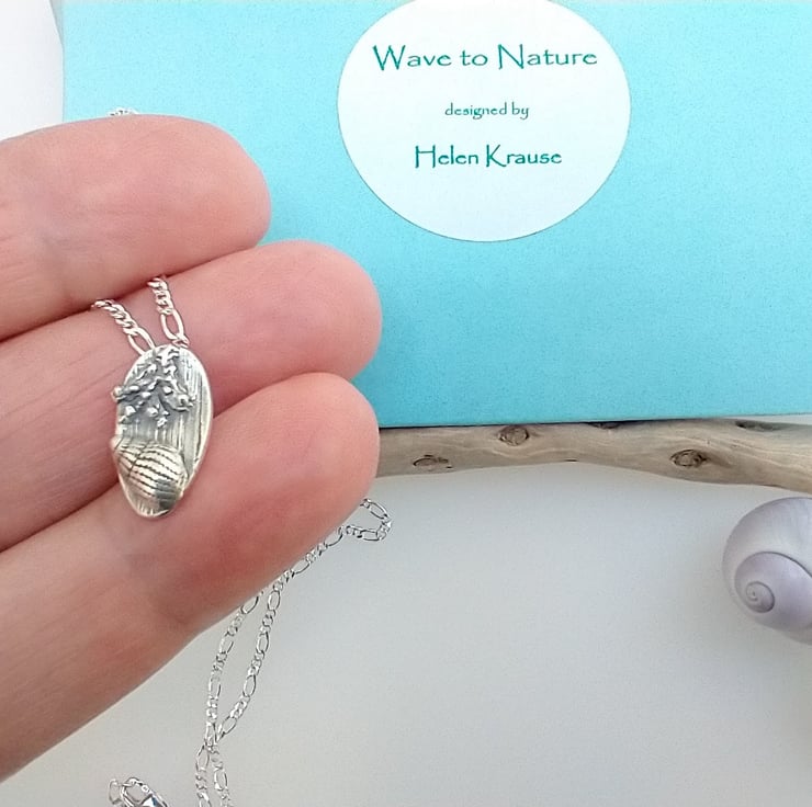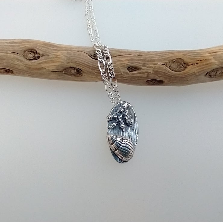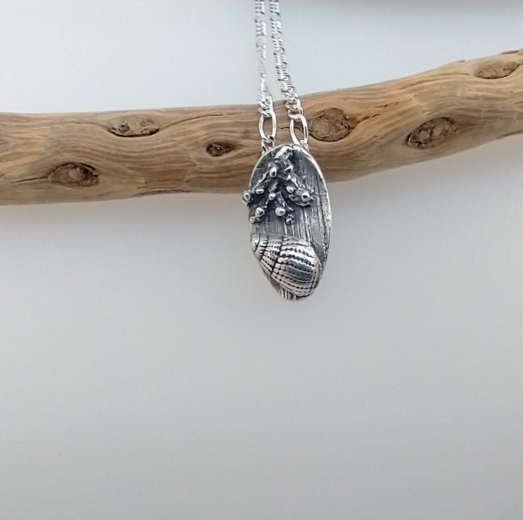 This dainty miniature driftwood fine silver necklace has been made using the mould of a real shell I found on a UK beach. It is designed to look naturally weathered and lived on by organic sea-life. After firing it has been sanded, oxidised and highly polished by hand and hangs from a sterling silver figaro chain. A perfect beach themed gift for a man or woman.