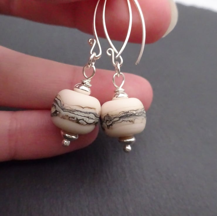 A pair of earrings made with handmade sterling silver ear wires, sterling silver beads and handmade lampwork glass beads.