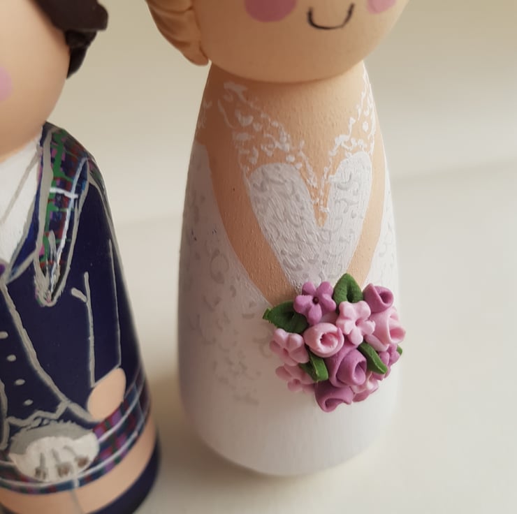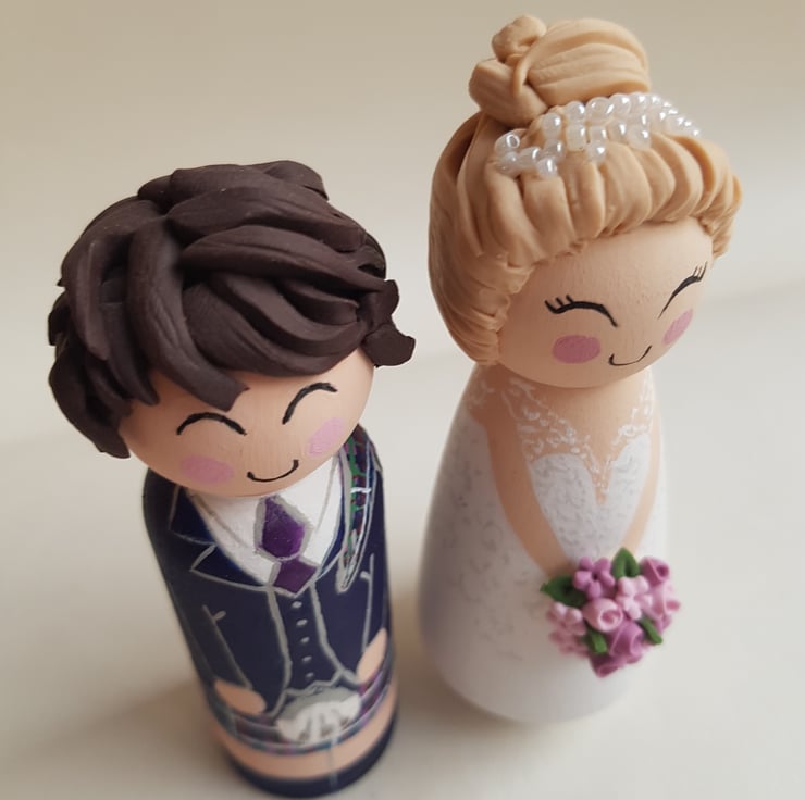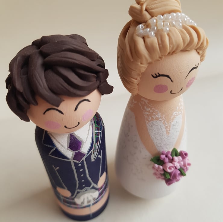 Each topper is approx 9 cm high peg doll, hand painted to look like you on your wedding day, with a gorgeous cute face.