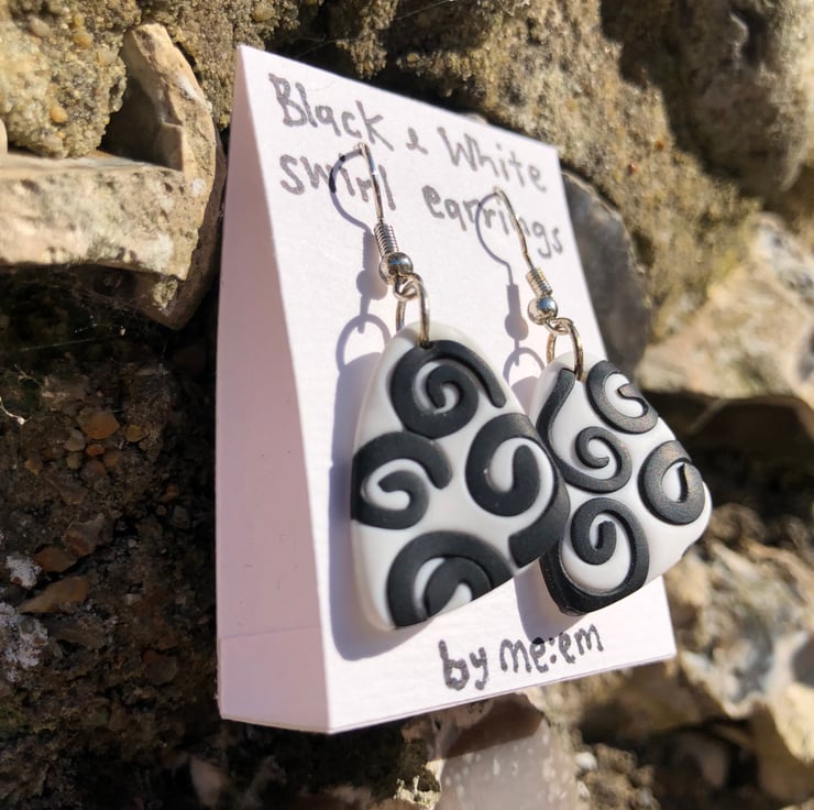 These silver plated earrings are made from polymer clay. Each earring has a black swirl design pressed into white clay as seen in the photos.