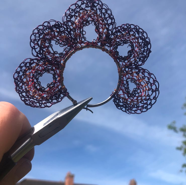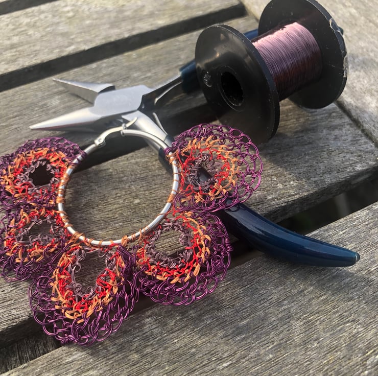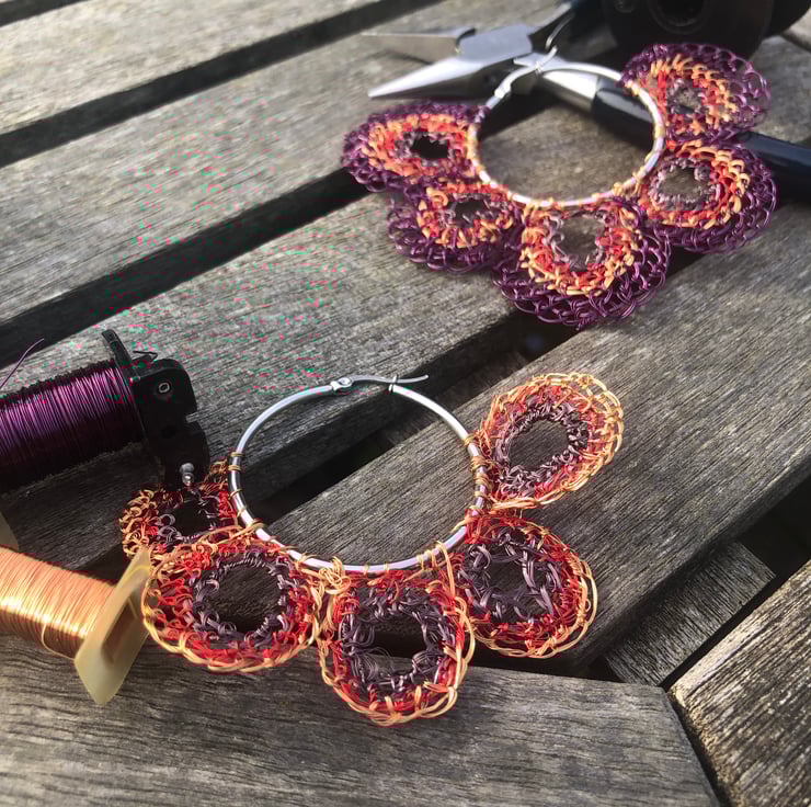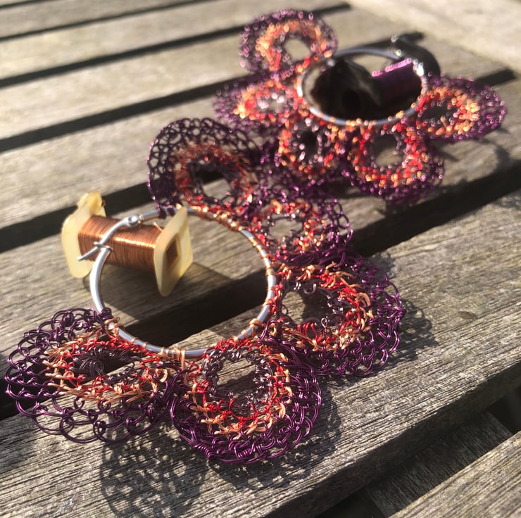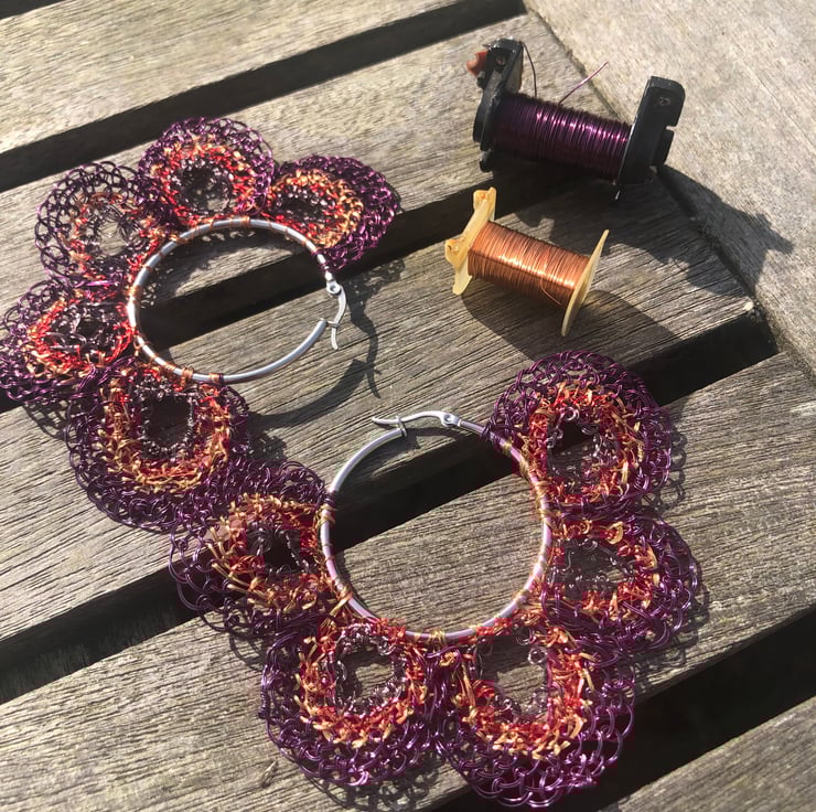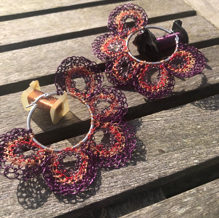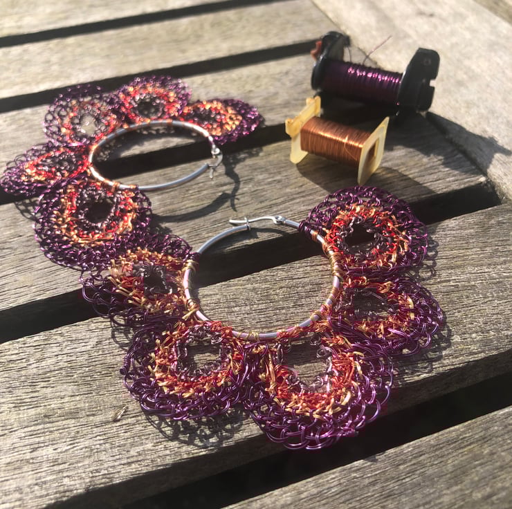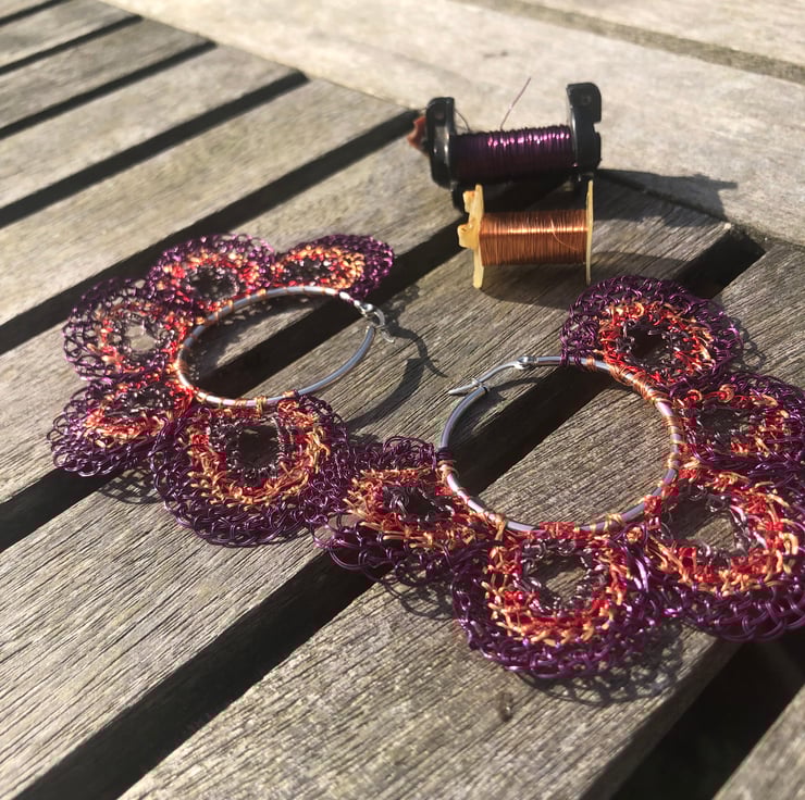 Purple and copper wire hoops - stainless steel hoops and recycled wire. In recycled box