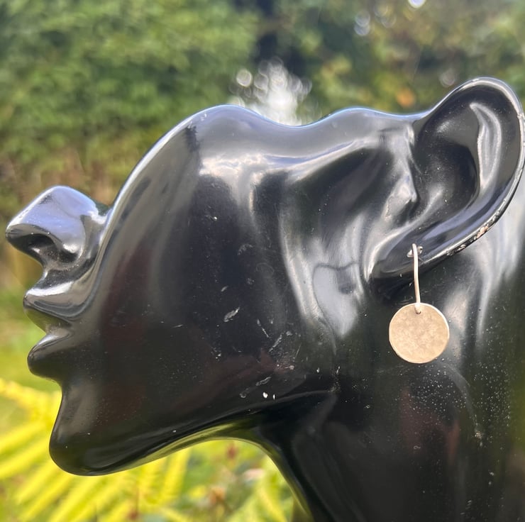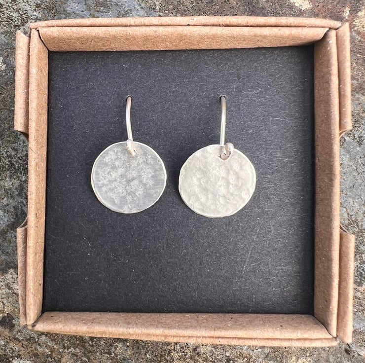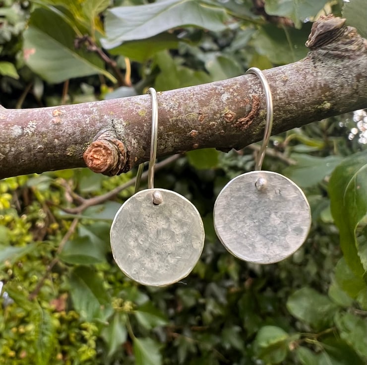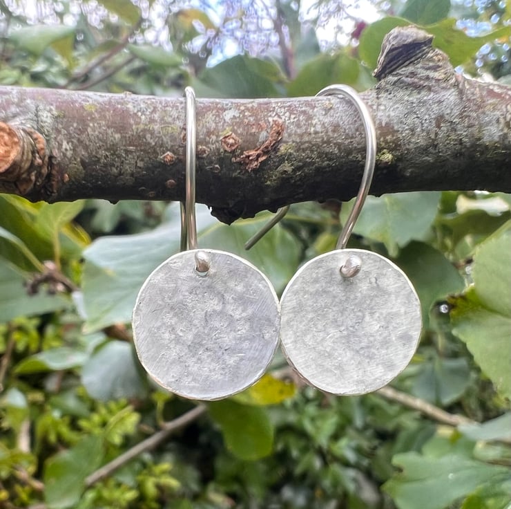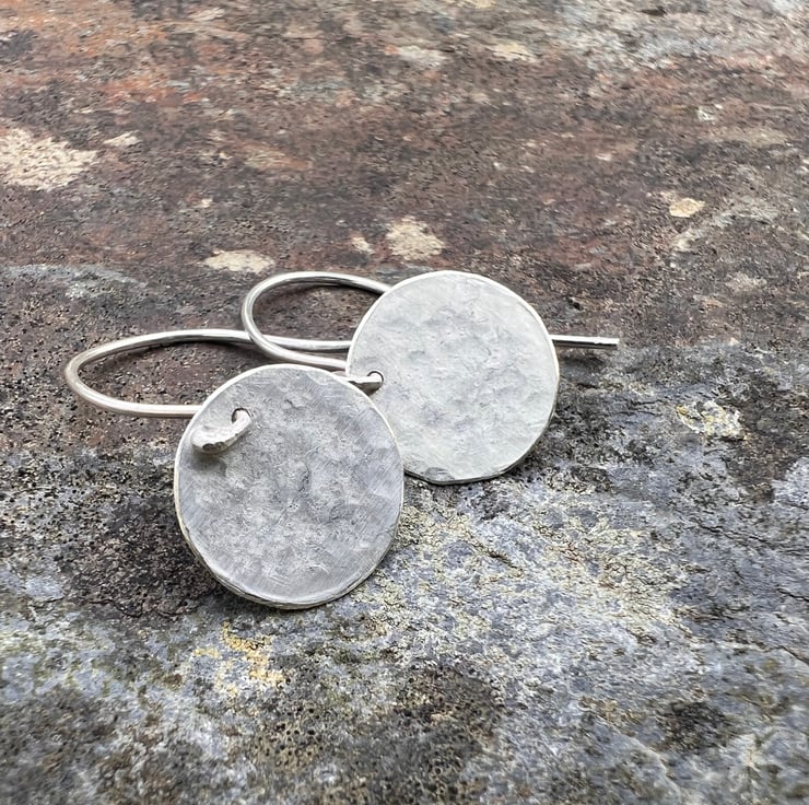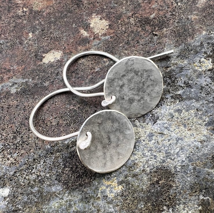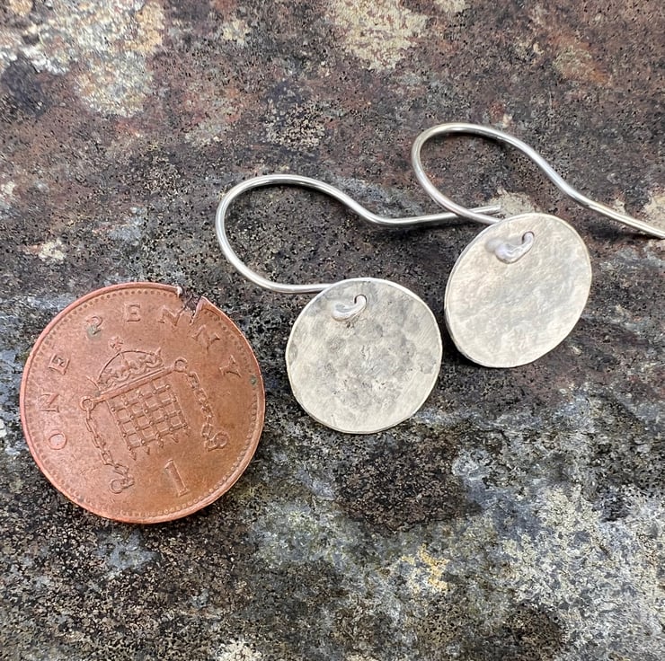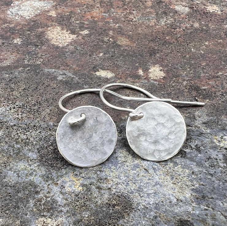 Delicate hammered silver circles dangling from sterling silver handmade ear hooks. The edges of the circles have gained a natural wavy line due to the hammering. The diameter of the circle is 14mm/half an inch.