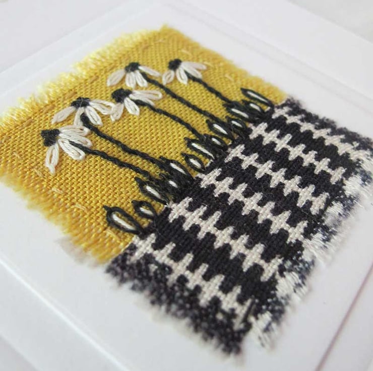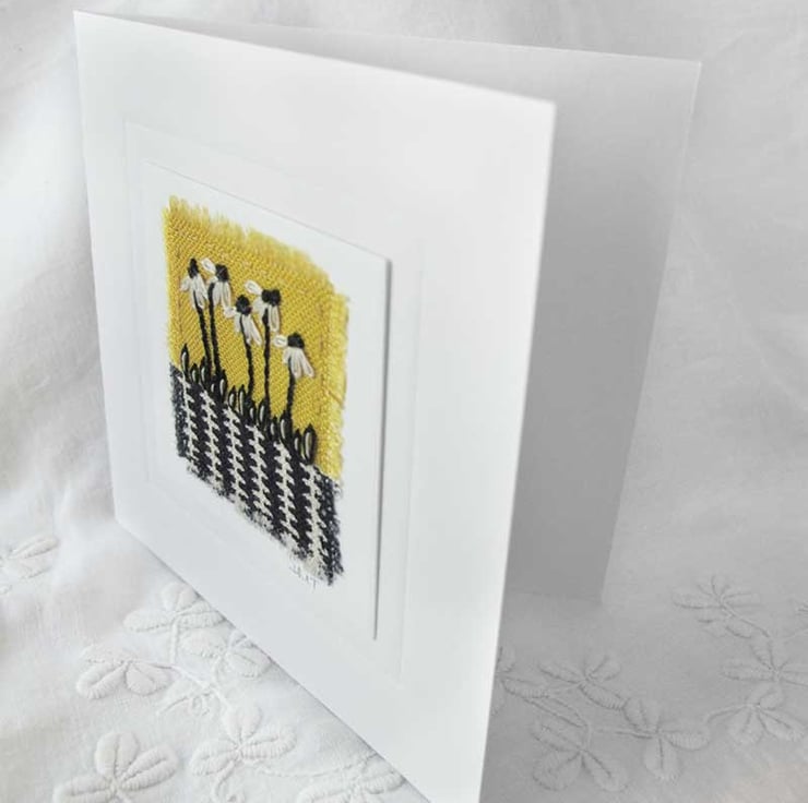 This beautiful card has been embroidered by hand onto a piece of genuine 1950's fabric. The embroidery design is of daisy style flowers in black and cream on a warm golden yellow with black and white patterned background. Perfect for a special occasion, it has been left blank for your own message. The embroidery has been mounted on card and then mounted onto the card base with an embossed frame around it.