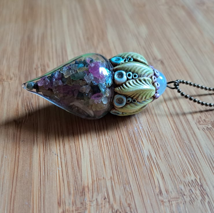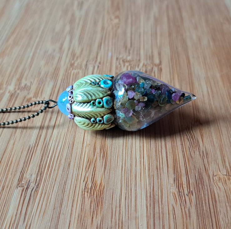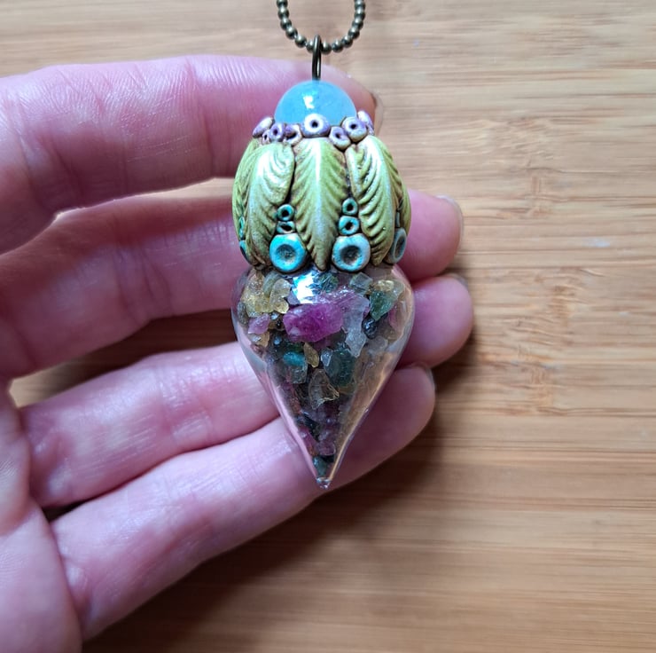 A really pretty wearable piece made from a large glass vial filled with watermelon tourmaline chips and finished with angelite and air dry epoxy resin clay which is super tough. All my amulets are attached to a bronze or copper ball chain that fits easily over the head. It can be made shorter by cutting and refitting back into the ball chain clasp.