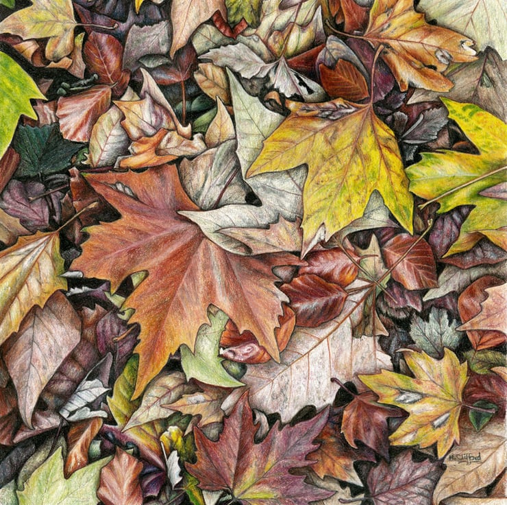 ‘Fallen Leaves No.3’ – This is a unique original drawing, one of a set of four in which the striking colours of autumn appear in a blanket of fallen leaves. The drawing captures a moment on a sunny autumn day when nature shows its finest colours.