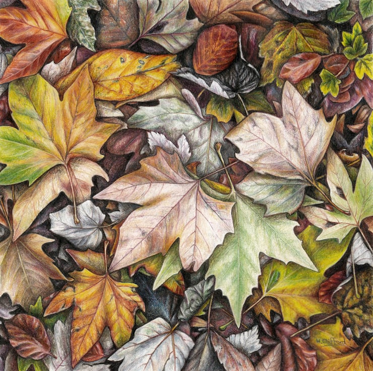 ‘Fallen Leaves No.4’ – This is a unique original drawing, one of a set of four giving a close-up view of a carpet of fallen leaves in glorious autumn colours. Nature herself created the warmth and golden hues in this composition.