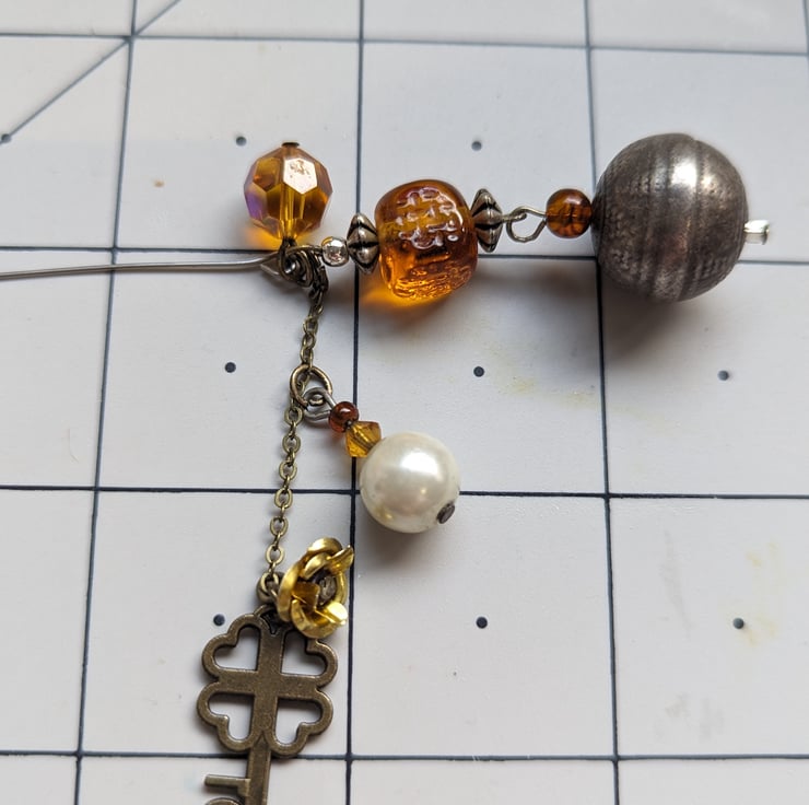Bronze thin chain with a key charm and gold rose a pearl and golden charm part way