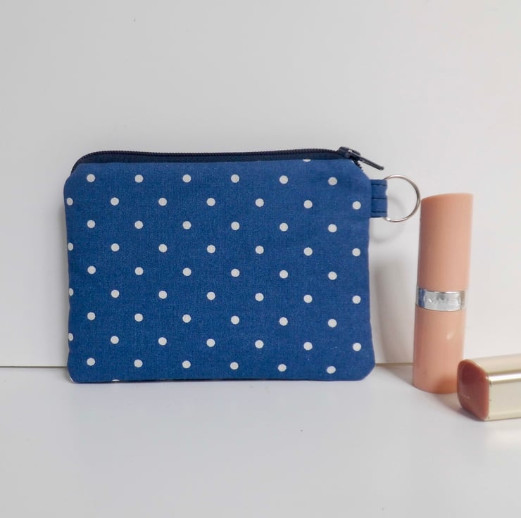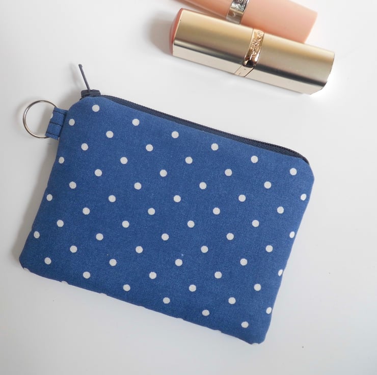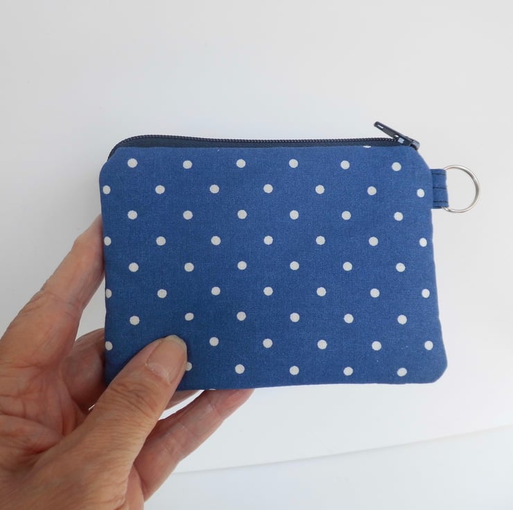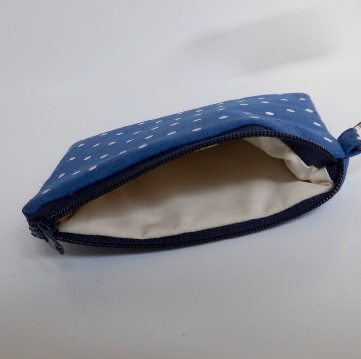 This coin purse is made using a quality quilting cotton which has a blue background with small white spots. I backed the fabric with fusible fleece for softness and body and have inserted a jump ring into one of the side seams so that it is easy to attach to your keyring or inside a bag. Lined with plain cream poly/cotton fabric.