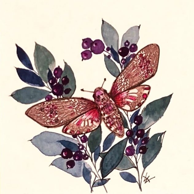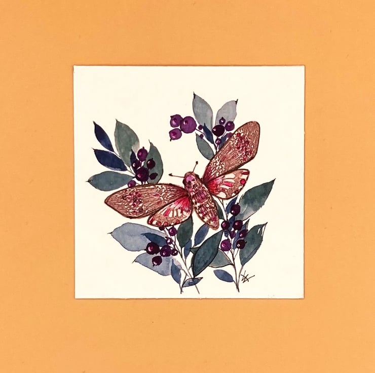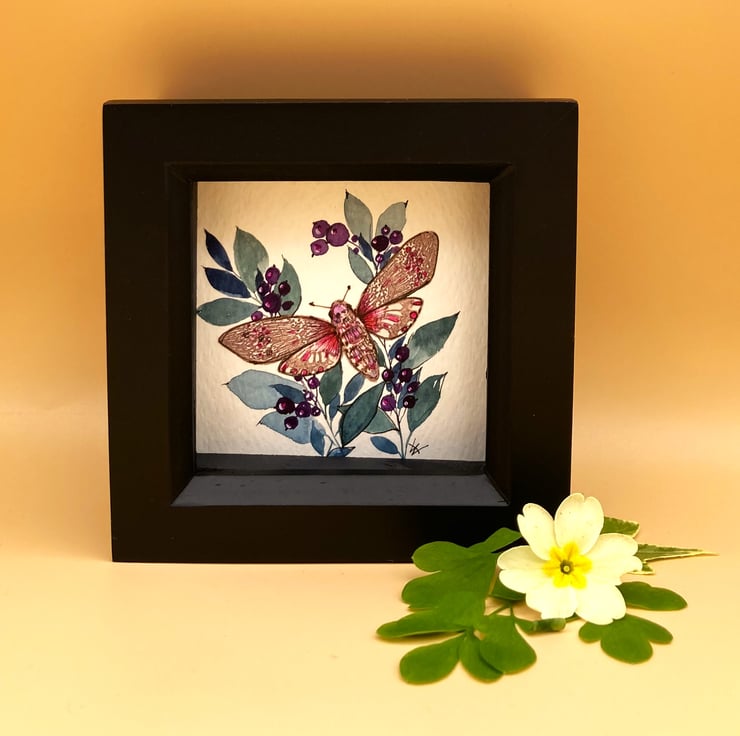 This tiny mixed media painting of a pink Deaths Head Hawk Moth with a blue green floral spray and rich dark purple berries is presented in a black box frame and signed & dated by me. I have hand painted the floral spray using professional artist quality watercolours and the spray underlies one of my hand coloured and enhanced printed hawk moths. The fragility and delicacy of the moth and flowers make this little painting an attractive, unusual and quirky gift, The combination of print and hand-painting make each one completely unique.