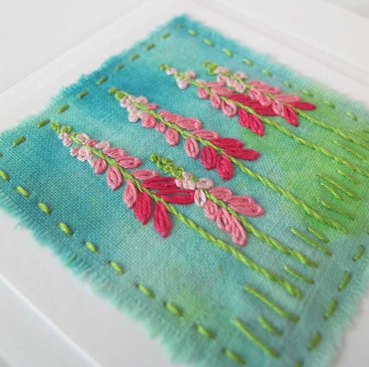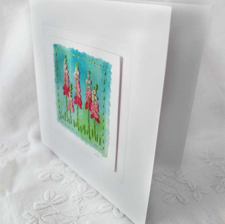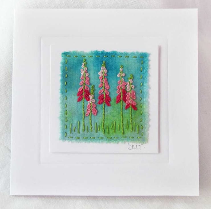 This beautiful card has been embroidered by hand onto fabric that I have dyed in shades of green and turquoise. The design is of Foxgloves in shades of pink - perfect for a special occasion, or perhaps framing it as it is. It has been mounted on a card base and is surrounded by an embossed square. The card has been left blank for your own message.