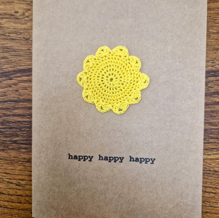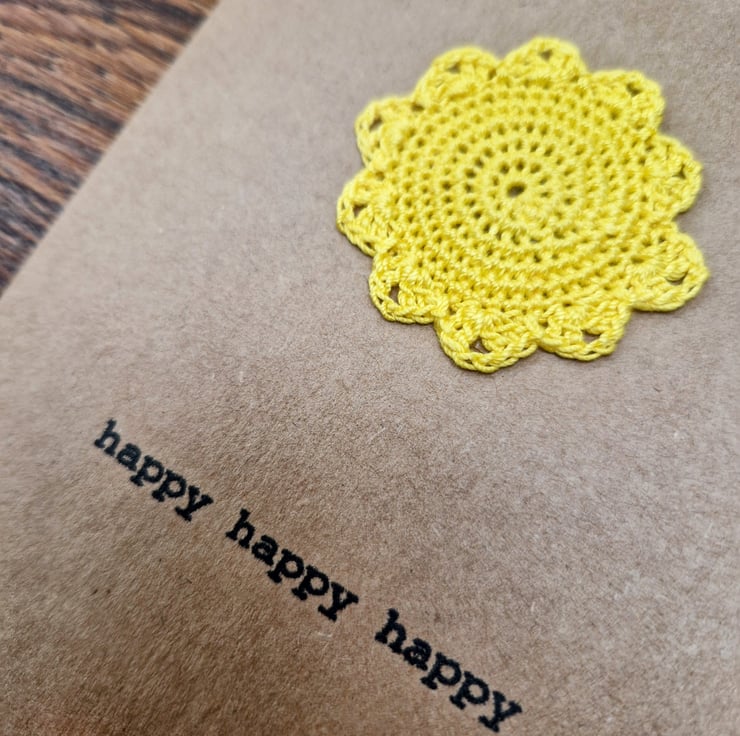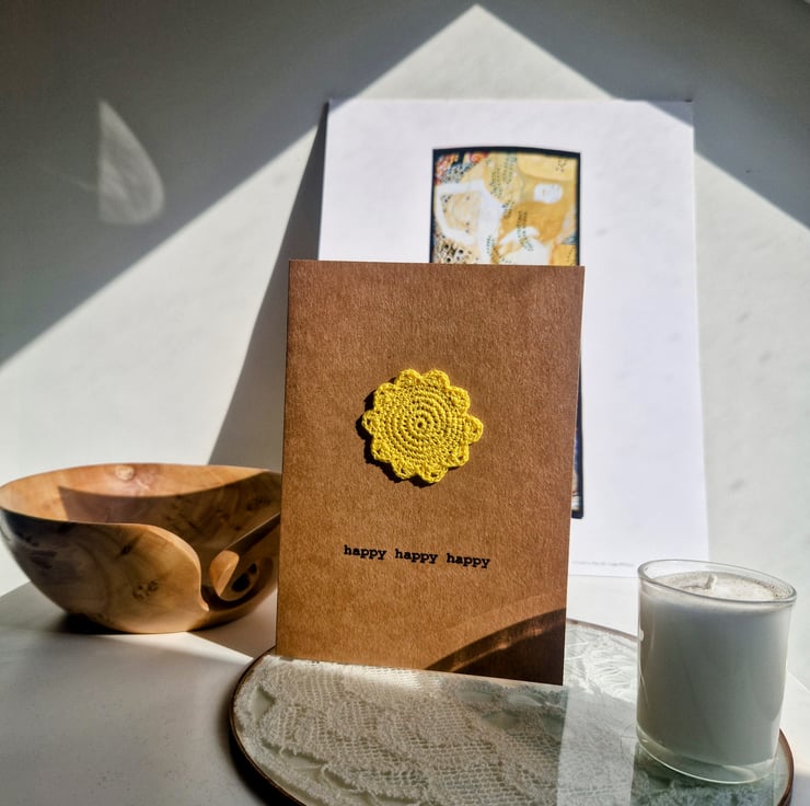 A bright yellow crocheted sunshine sits on a Kraft card printed with the message ‘happy happy happy’.