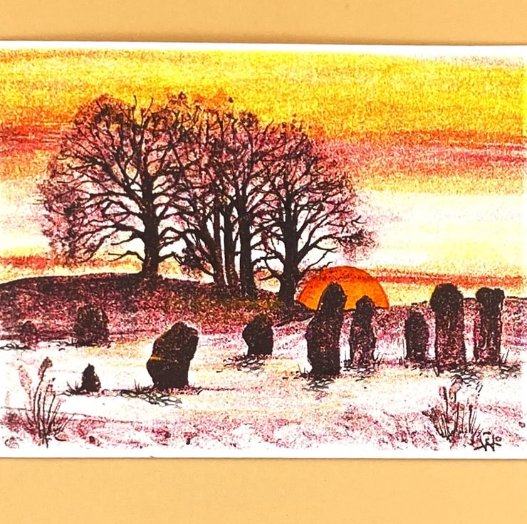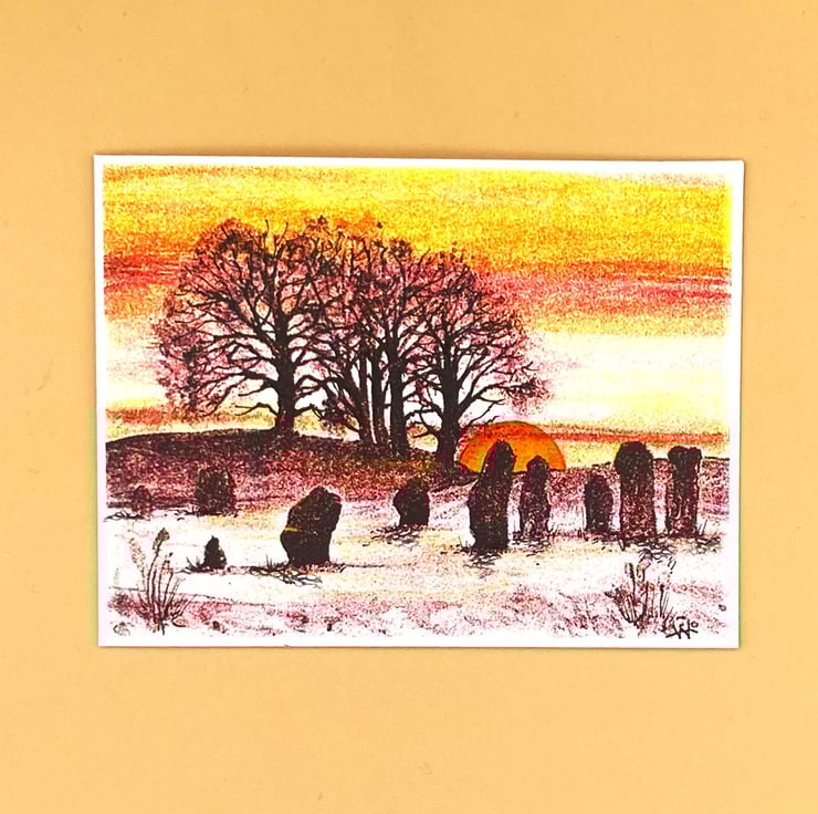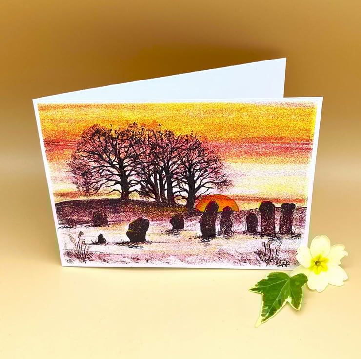 This greetings card of Avebury standing stone circle (version 2) shows the evening sun setting almost behind the trees standing on the little rise. The ancient stone circle is a wonderful place and has a profound magic all of it's own especially at sunset. The image is taken from my original watercolour painting and I have tried to capture a little of the stones spirit. It is a blank card for your own message.