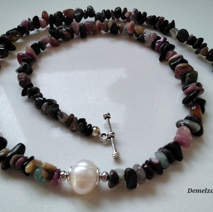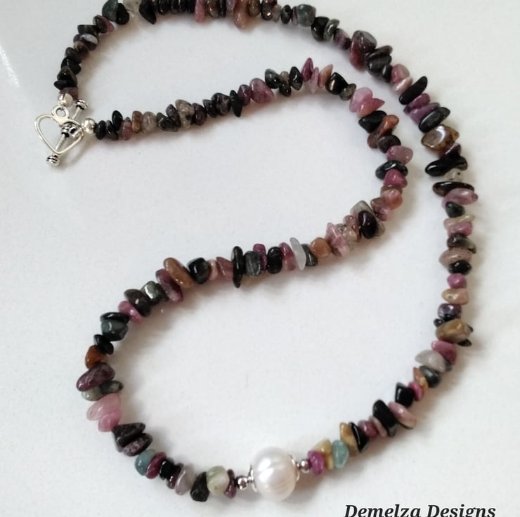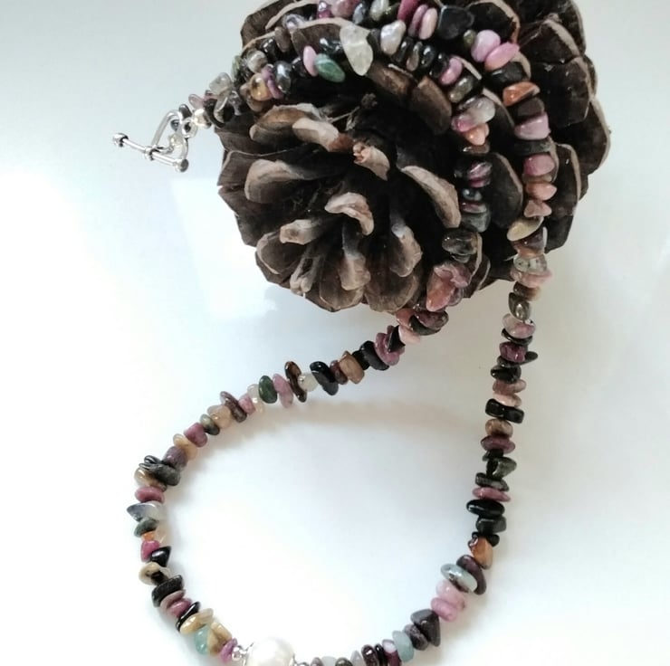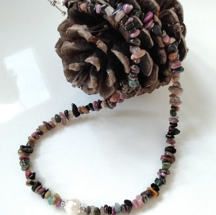 This dainty freshwater culture pearl and multicoloured tourmaline nugget necklace has been lovingly designed and hand crafted in Cornwall. The cream baroque centre pearl chosen compliments the tourmaline nuggets with quality silver plated bead caps and 2.5mm silver plated spacer beads.