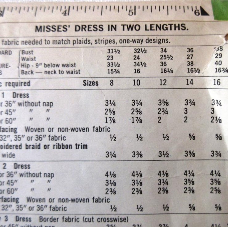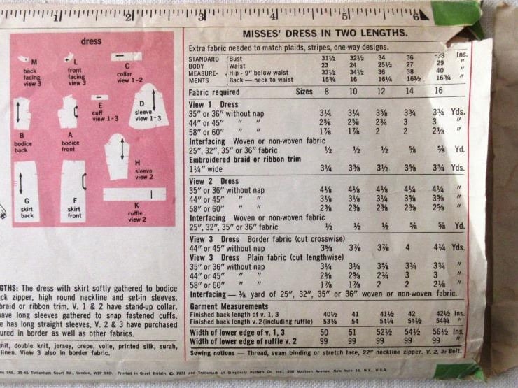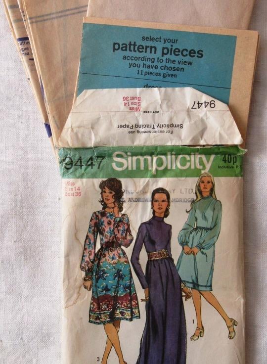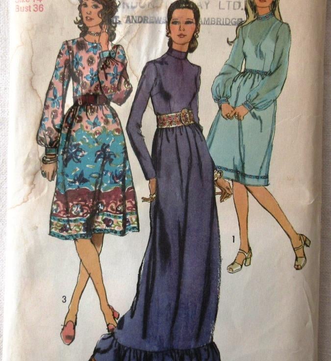A sewing pattern for a misses' dress in two lengths in size 14 (bust 36"/91.5 cm, Simplicity 9447). The dress with skirt softly gathered to bodice at normal waistline has back zipper, high round neckline and set-in sleeves. View 1 features embroidered braid or ribbon trim. Views 1 and 2 have stand-up collar. Regular length views 1 and 3 have long sleeves gathered to snap-fastened cuffs. Ankle-length view 2 with ruffles has long straight sleeves. Views 2 and 3 have purchased belts. View 3 is collarless. The pattern has been used to make the long version with full sleeves, but without the stand-up collar and ruffle. The envelope is slightly torn. The pattern is dated 1971.