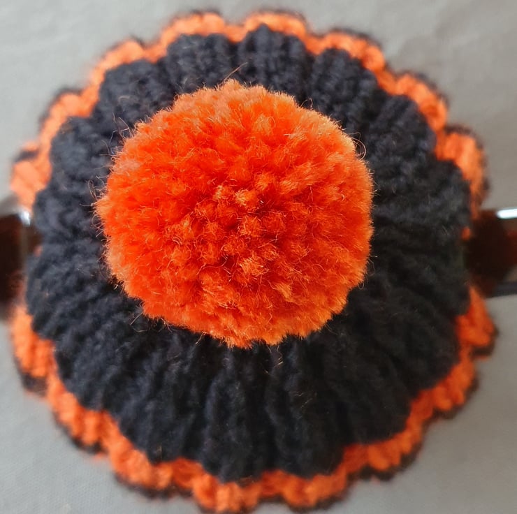 Small Tea Cosy for 2 Cup Tea Pot, Black & Orange, Hand Knitted, Wool Mix Yarn