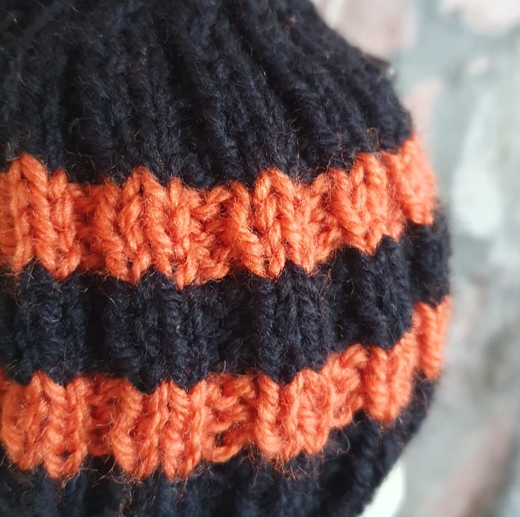 Small Tea Cosy for 2 Cup Tea Pot, Solid Black and Orange Stripes, Hand Knitted