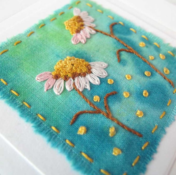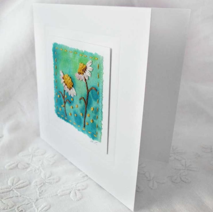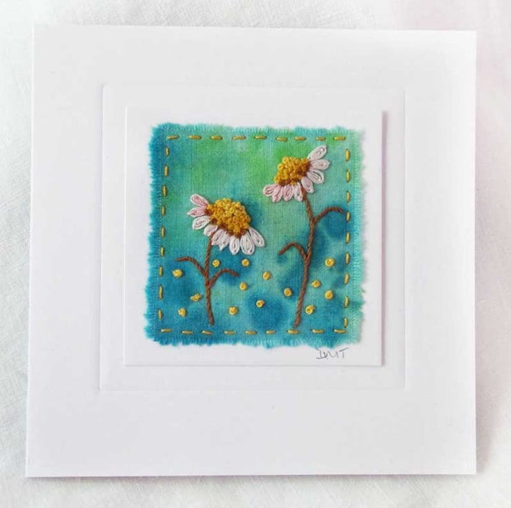 This beautiful card has been embroidered by hand onto fabric that I have dyed in shades of green and teal. The embroidery design is of daisy style flowers in a cream and pale pink - perfect for a special occasion, or perhaps framing it as it is. It has been mounted on a card base and is surrounded by an embossed square. The card has been left blank for your own message.