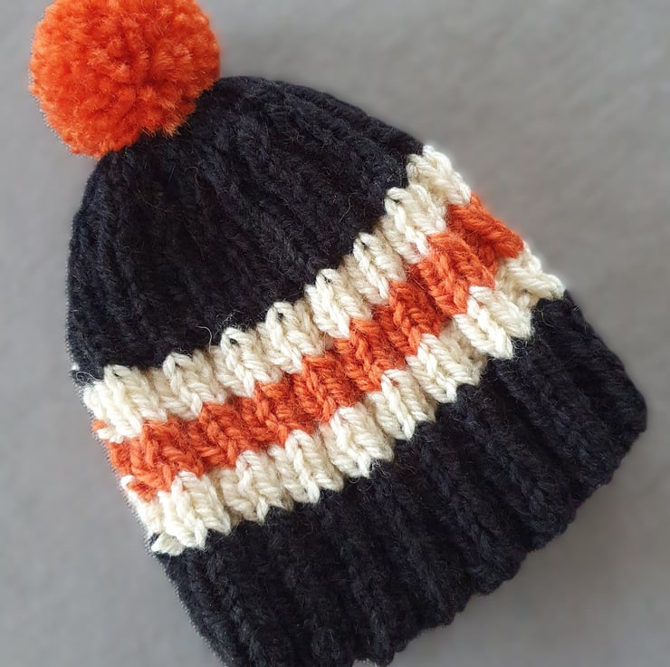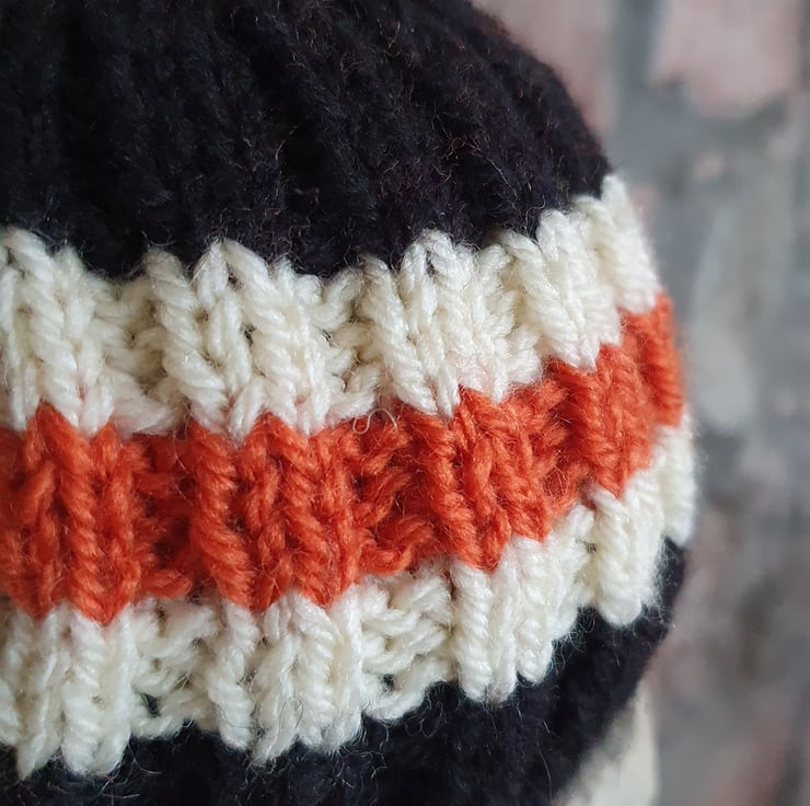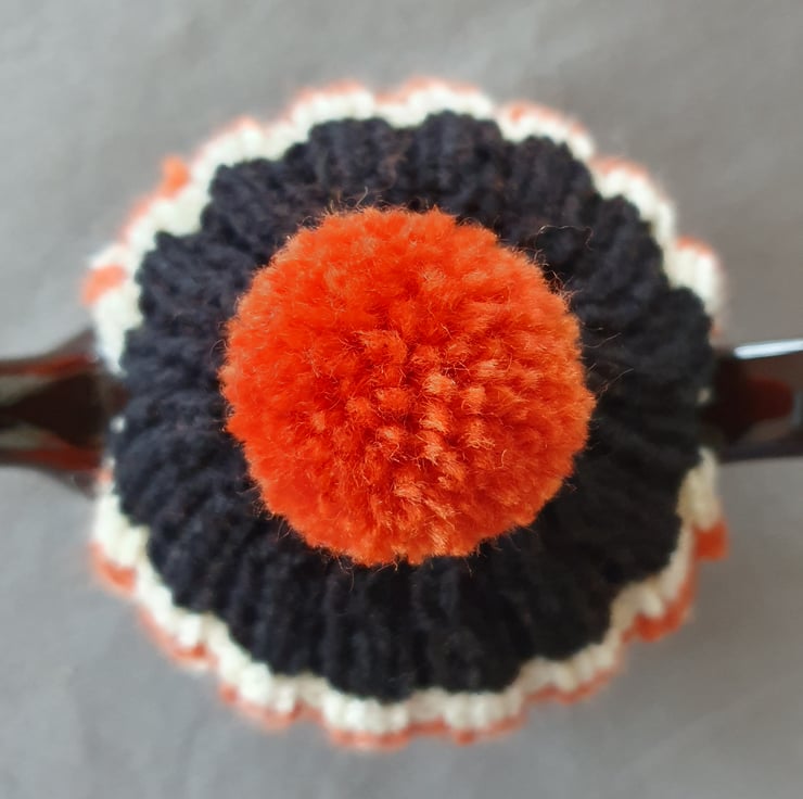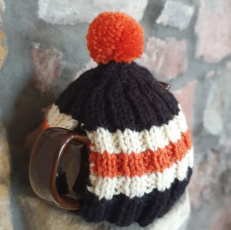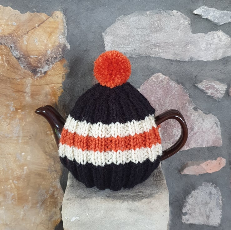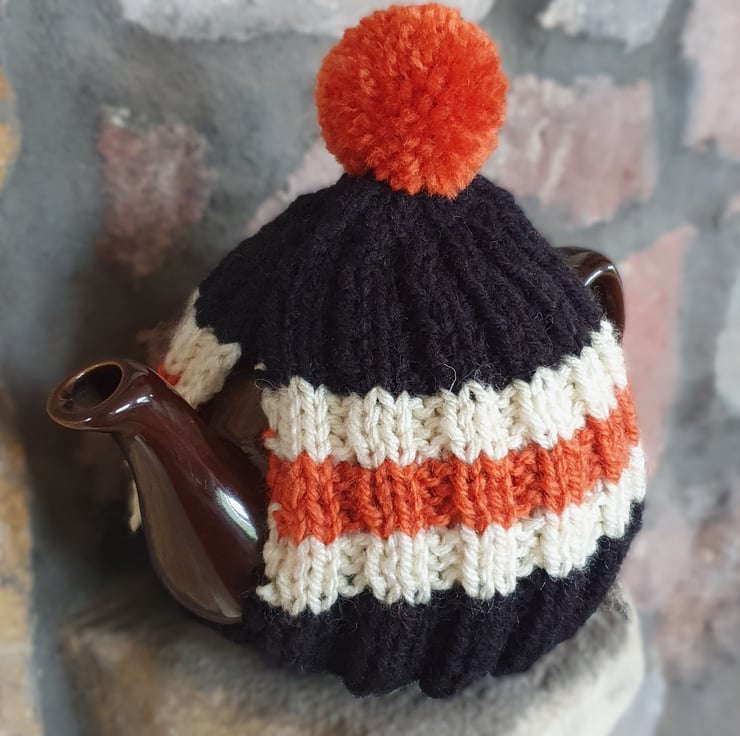 Small Tea Cosy for 2 Cup Tea Pot, Solid Black with Orange and Cream Stripes, Hand Knitted