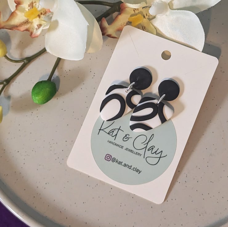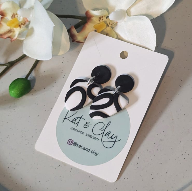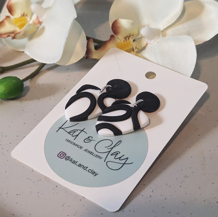 Black and white drop earrings in a rounded triangular shape, with a circular stud fixing. Made from FIMO polymer clay and silver coloured metal studs and fixings. The black lines on the main part of the earring are slightly raised.