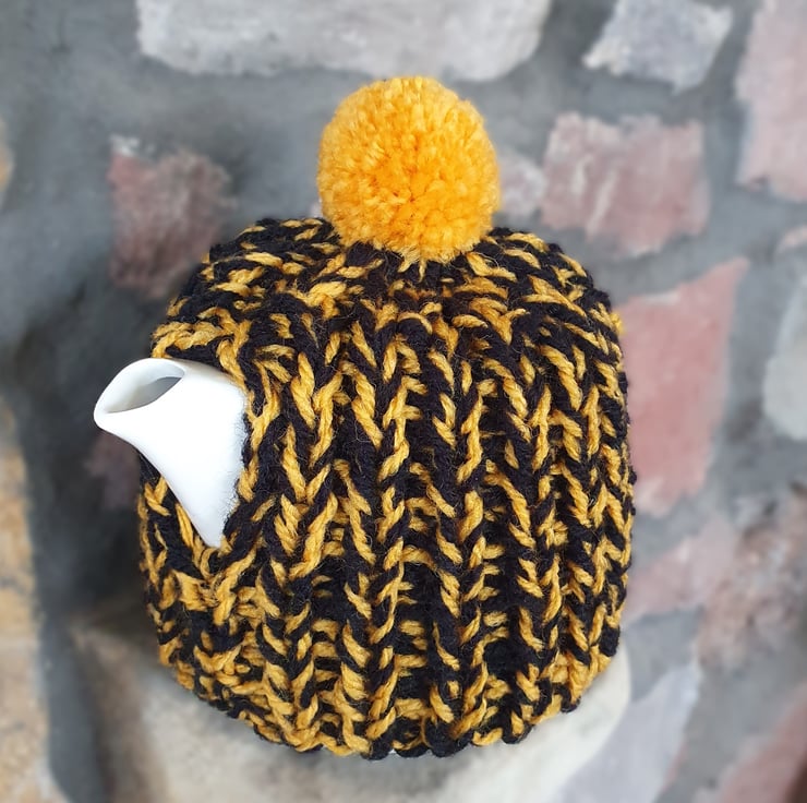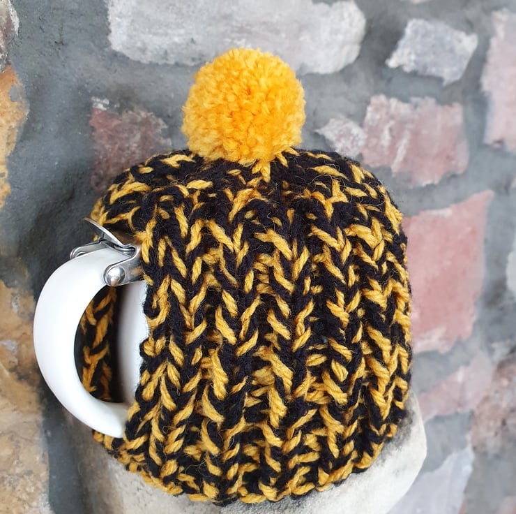 Hand knitted using double strands (two balls at the same time) of Aran weight yarn in a 1 x1 ribbed pattern, makes this cosy extra thick. It's not called a cosy for nothing!
