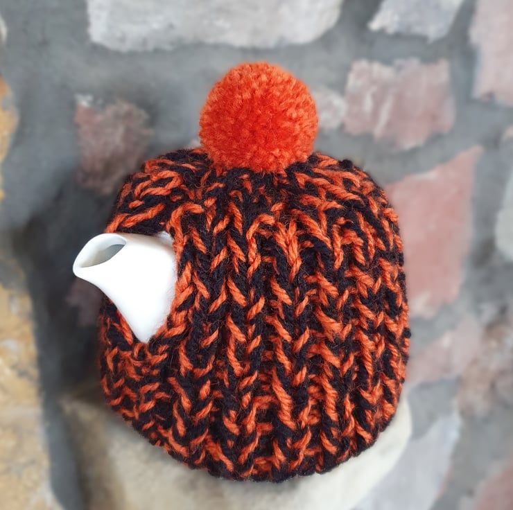 Hand knitted using double strands (two balls at the same time) of Aran weight yarn in a 1 x1 ribbed pattern, makes this cosy extra thick. It's not called a cosy for nothing!