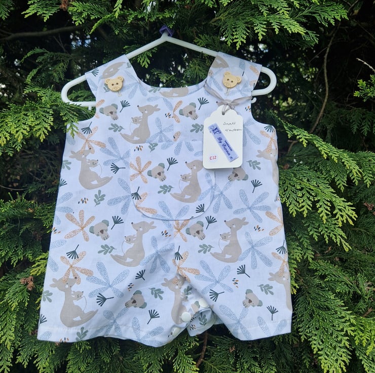 Age Small Newborn approx, pair of ivory cotton roomy rompers with a print of kangaroos, baby roos and koalas and a centre feature chest patch pocket detail, with wooden koala head shaped buttons and white poppers at the gusset for easy opening for nappy changes.