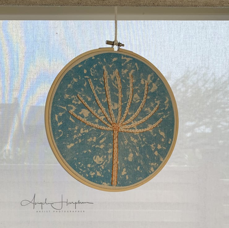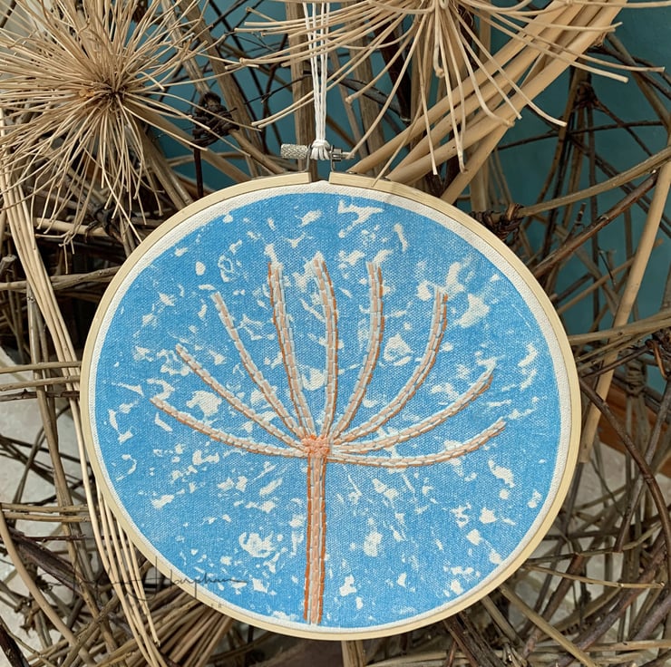 Linocut embroidered circular hoop hanging of an Agapanthus seedhead. Etched and cut lino was printed on canvas and then later hand embroidered in white and peach coloured thread. You could remove the hanging thread and place on a stand.