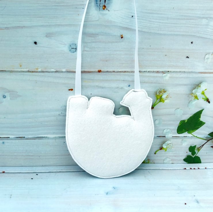 Made from a mix of Wool Blend Felt and Leatherette with a layer of polyester stuffing for padding and a Grosgrain or satin ribbon for hanging.